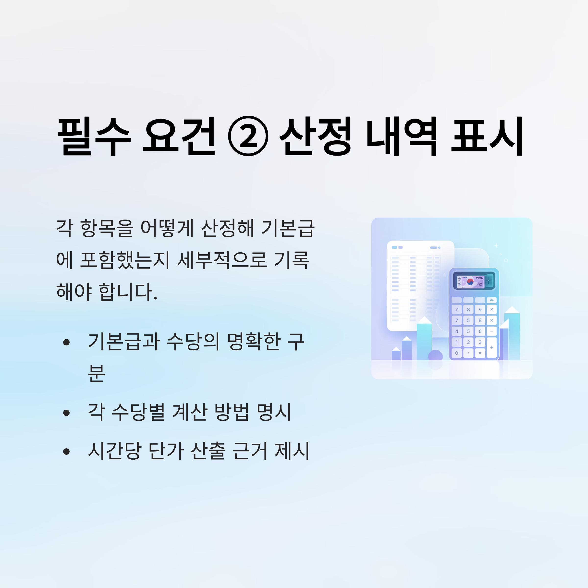 각 항목을 어떻게 산정해 기본급에 포함했는지 세부적으로 기록해야 합니다.