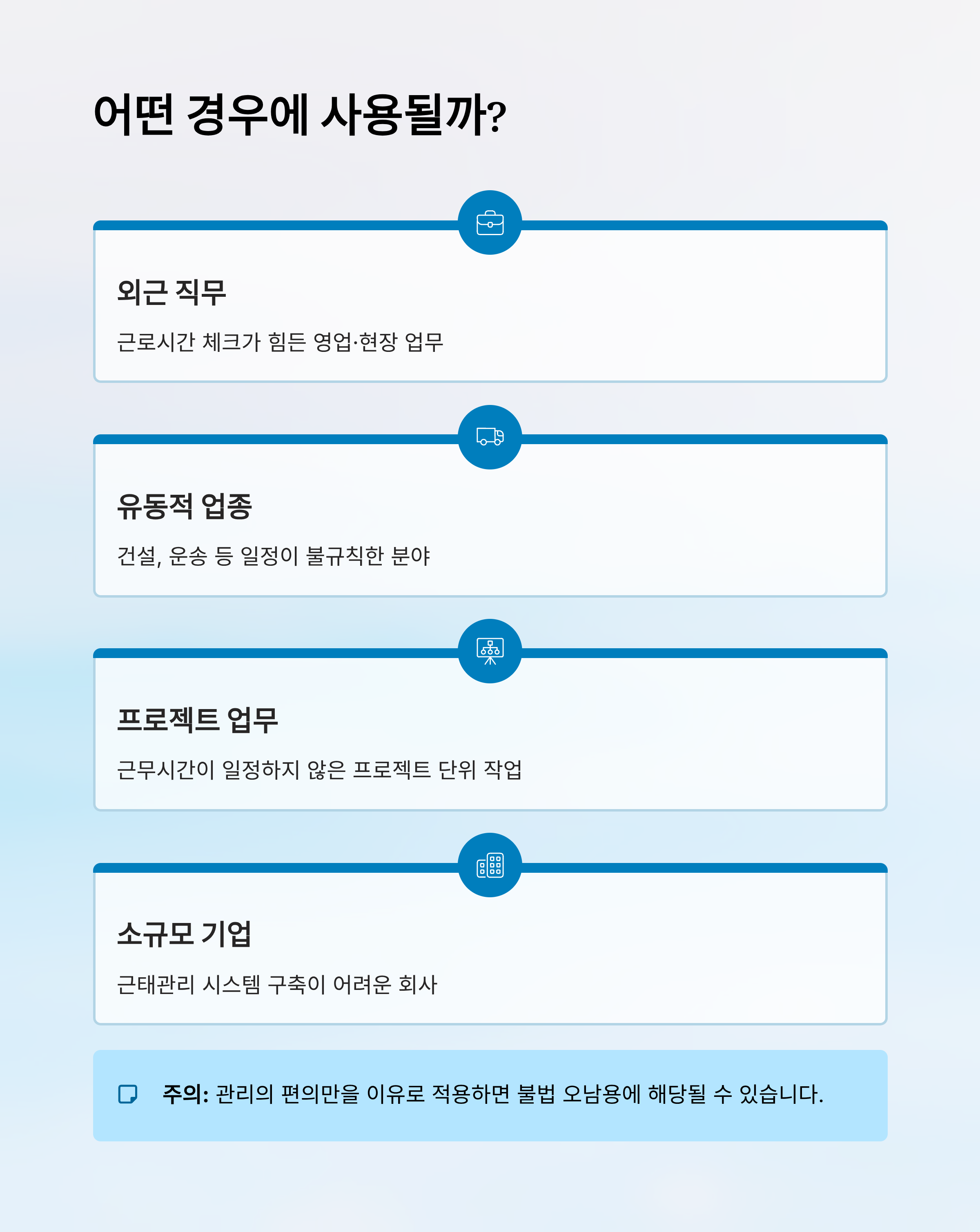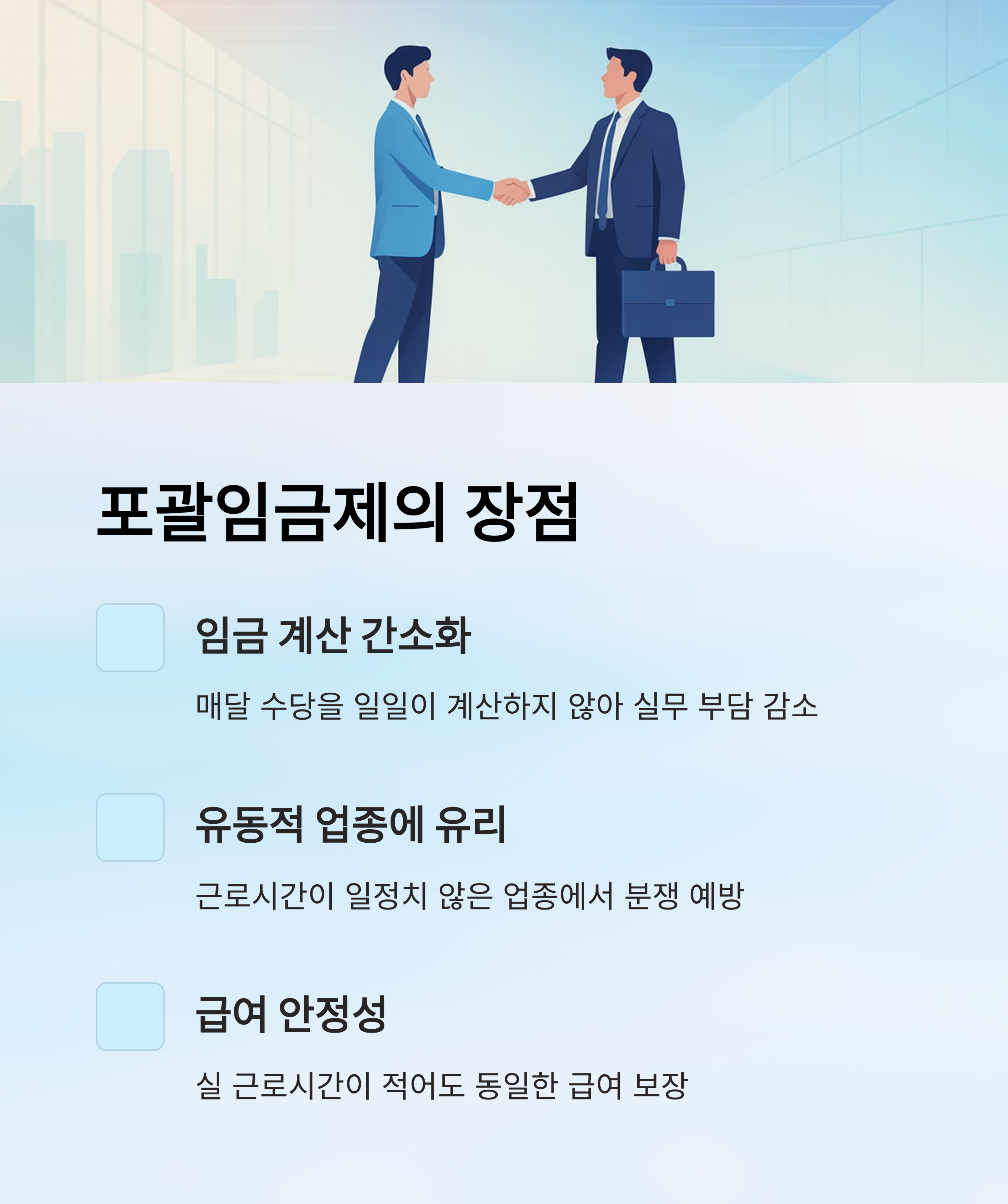 업무 특성상 근로시간이 일정치 않은 업종에서 분쟁을 줄이는 데 도움이 됩니다. - 초과근로가 많지 않은 경우 근로자에게도 일정한 급여 보장