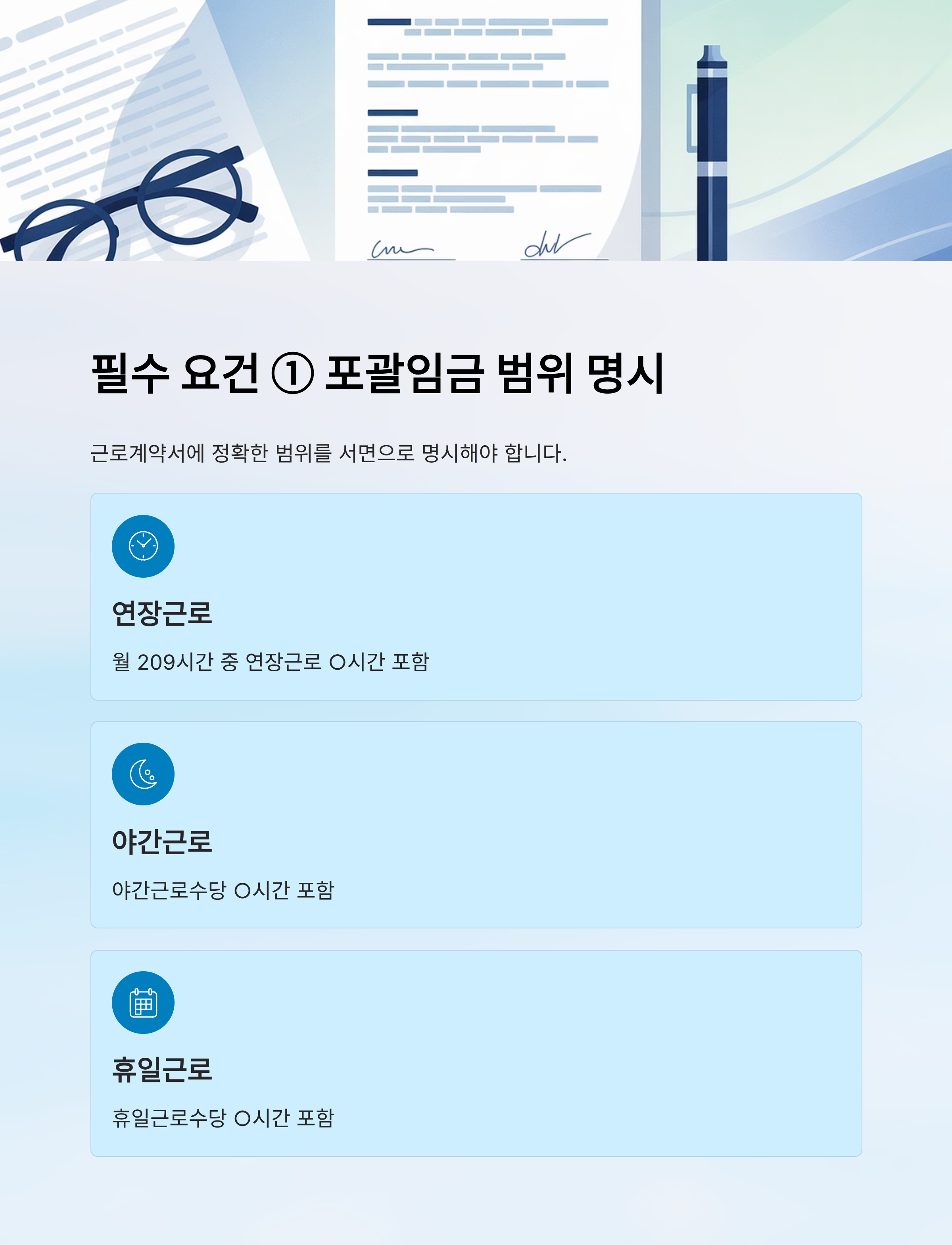 포괄임금제를 법적으로 문제 없이 운영하기 위해서는 아래 내용이 반드시 근로계약서에 서면으로 명시되어야 합니다.