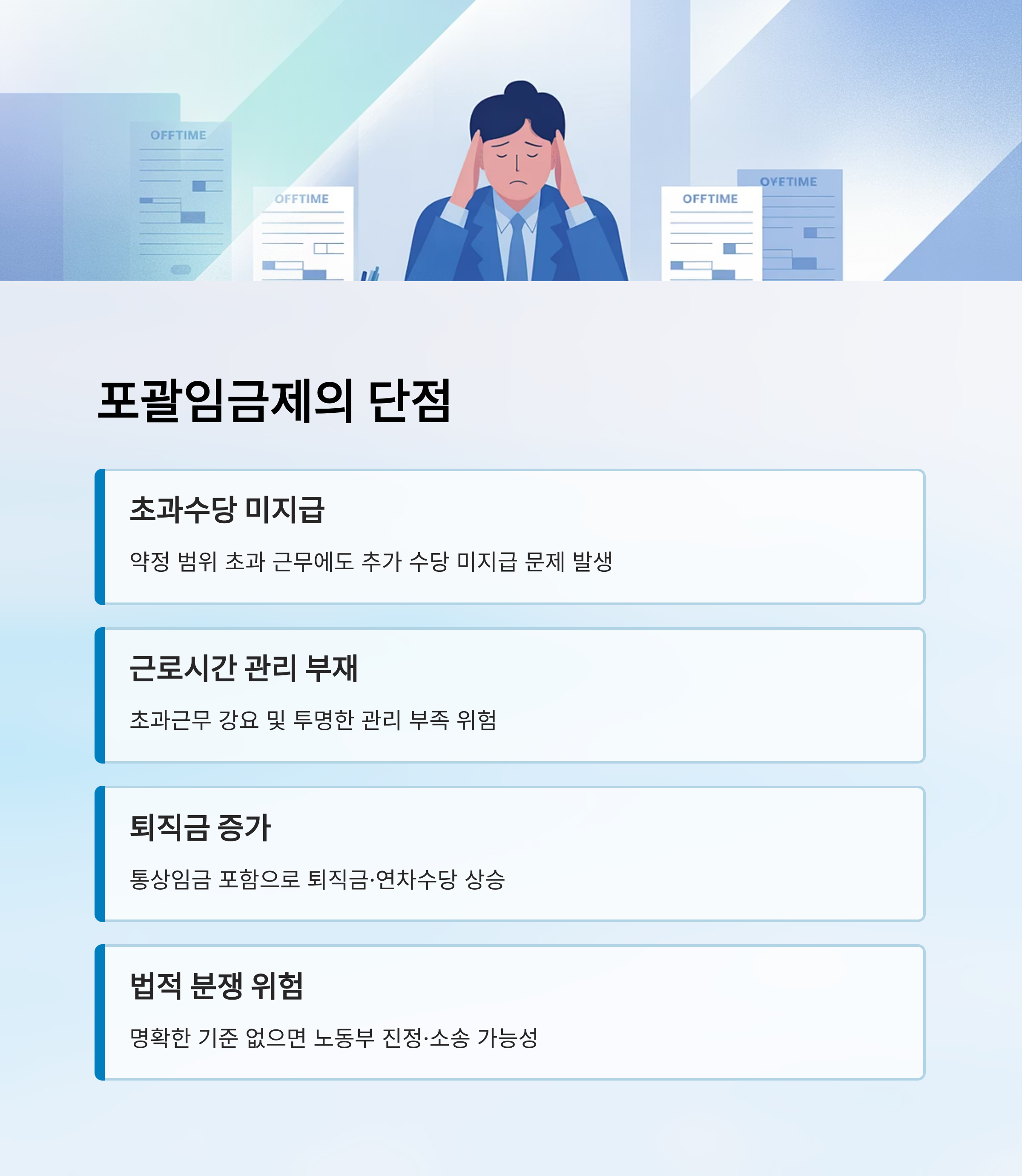 포괄임금제는 통상임금에 포함되는 경우가 많아, 퇴직금·연차수당 등이 증가합니다. - 법적 분쟁 발생 위험
