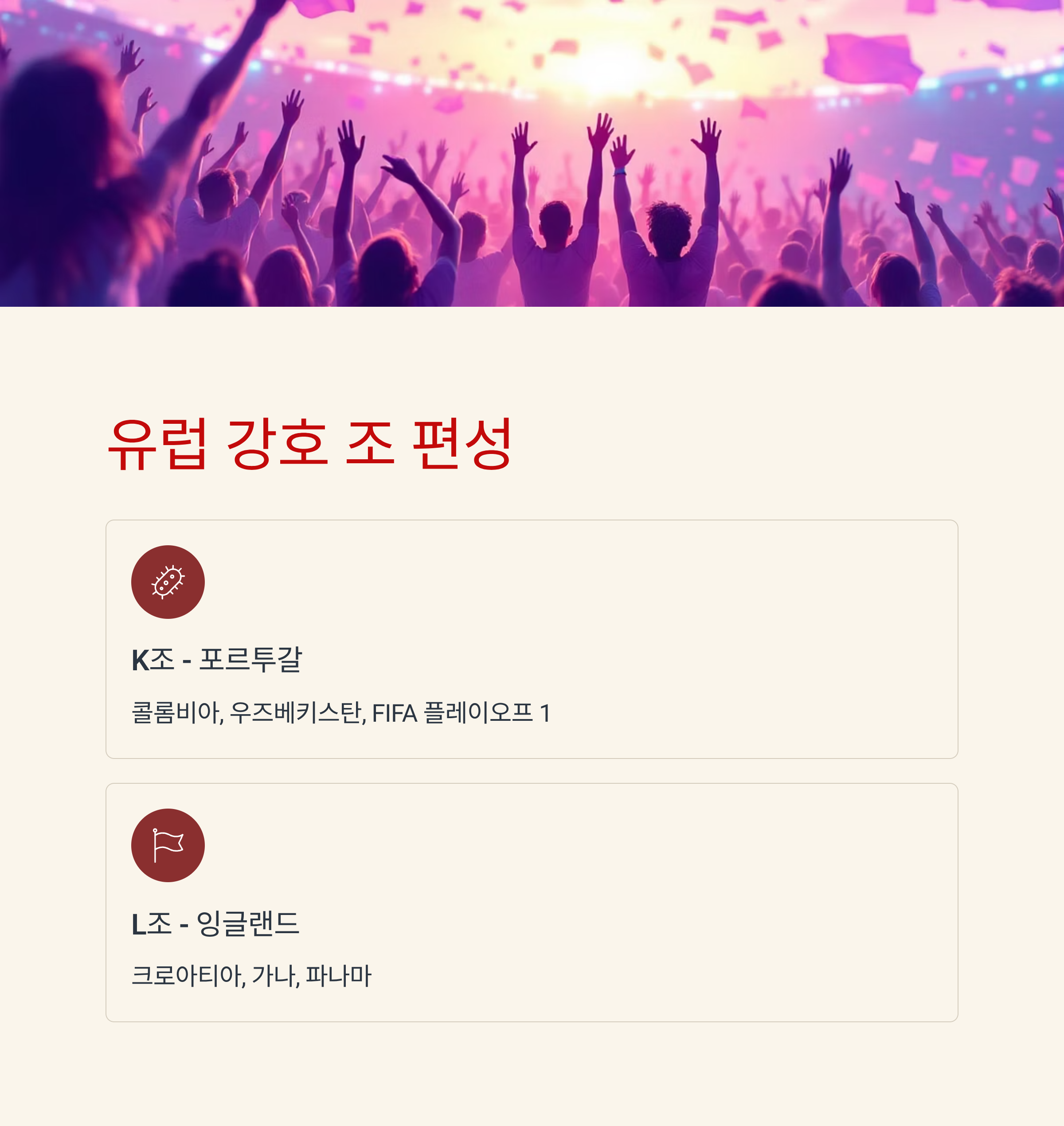 조추첨 직후 공개된 조 편성은 아래와 같습니다. 유럽 플레이오프 및 대륙간 플레이오프 자리 등 일부 팀은 2026년 3월 최종 확정됩니다.