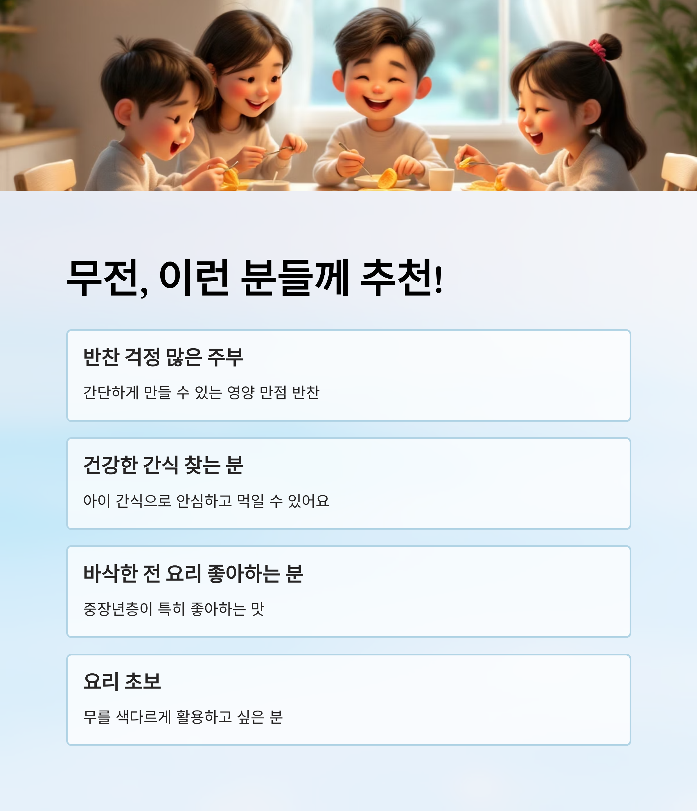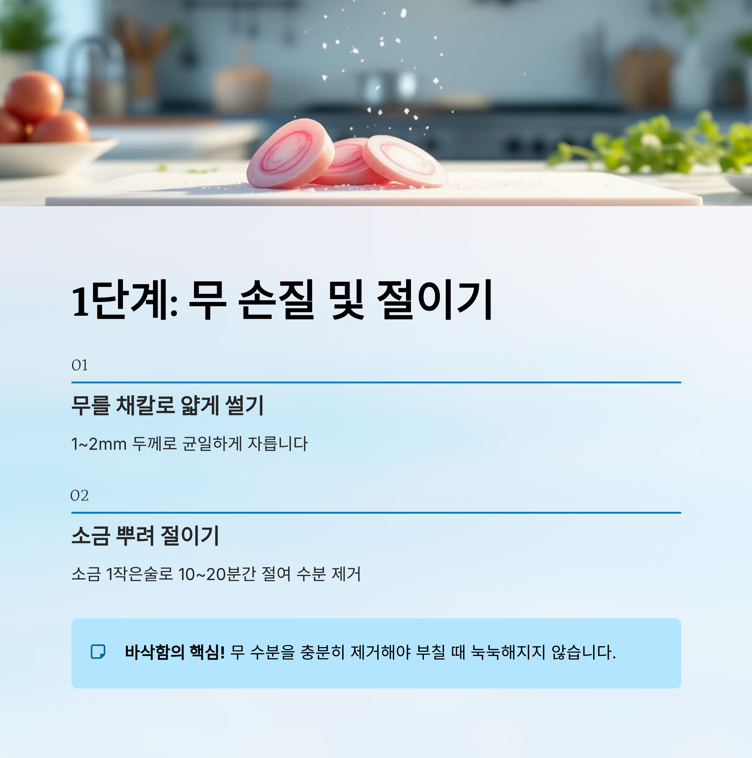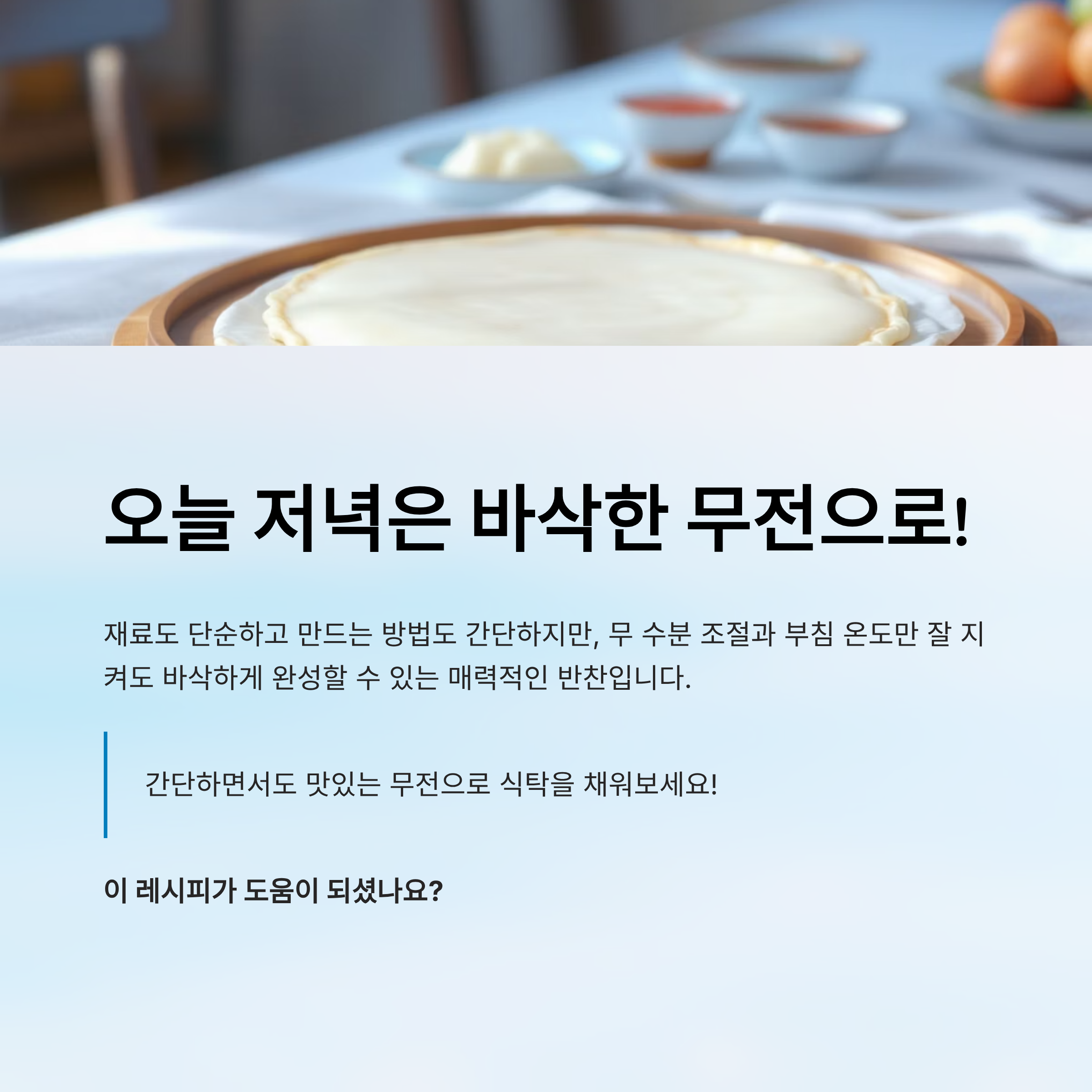 무전은 재료도 단순하고 만드는 방법도 간단하지만, 무 수분 조절과 부침 온도만 잘 지켜도 바삭하게 완성할 수 있는 매력적인 반찬입니다. 오늘 저녁, 간단하면서도 맛있는 무전으로 식탁을 채워보세요!