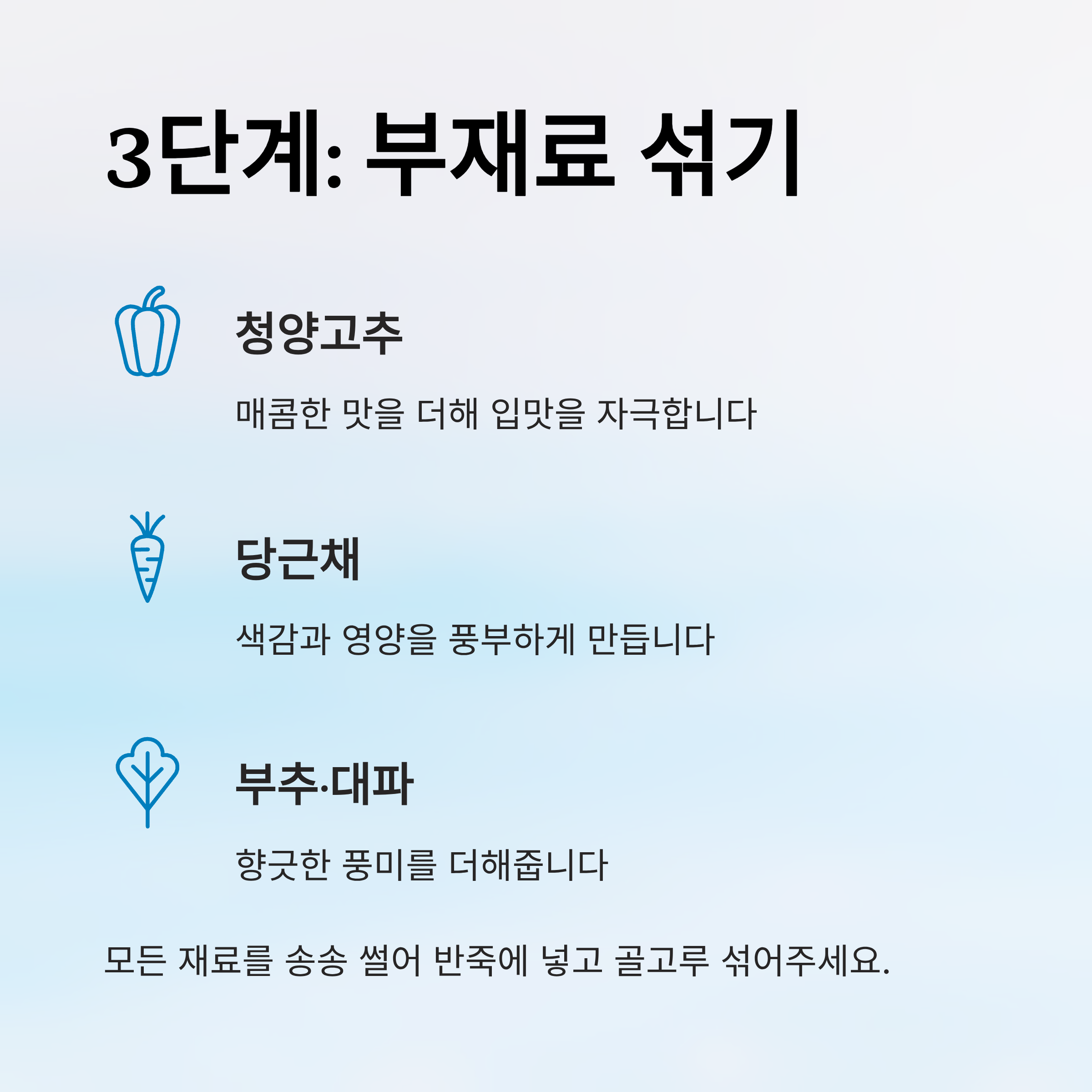 - 기타 부재료: 청양고추 1~2개, 당근채, 부추, 대파 약간 (기호에 따라 선택)
