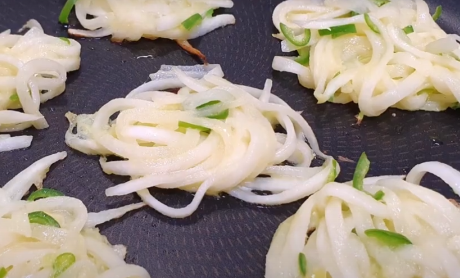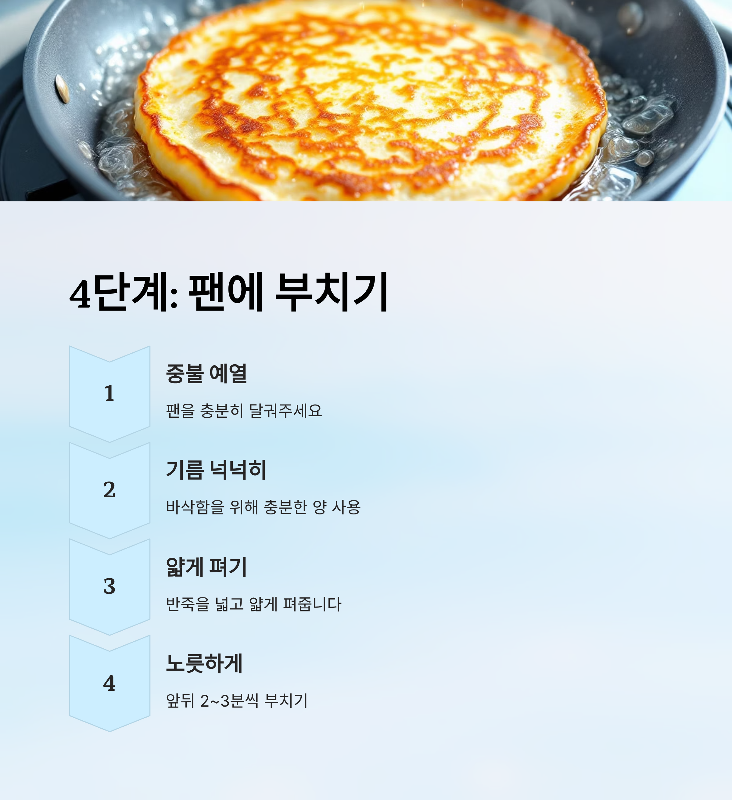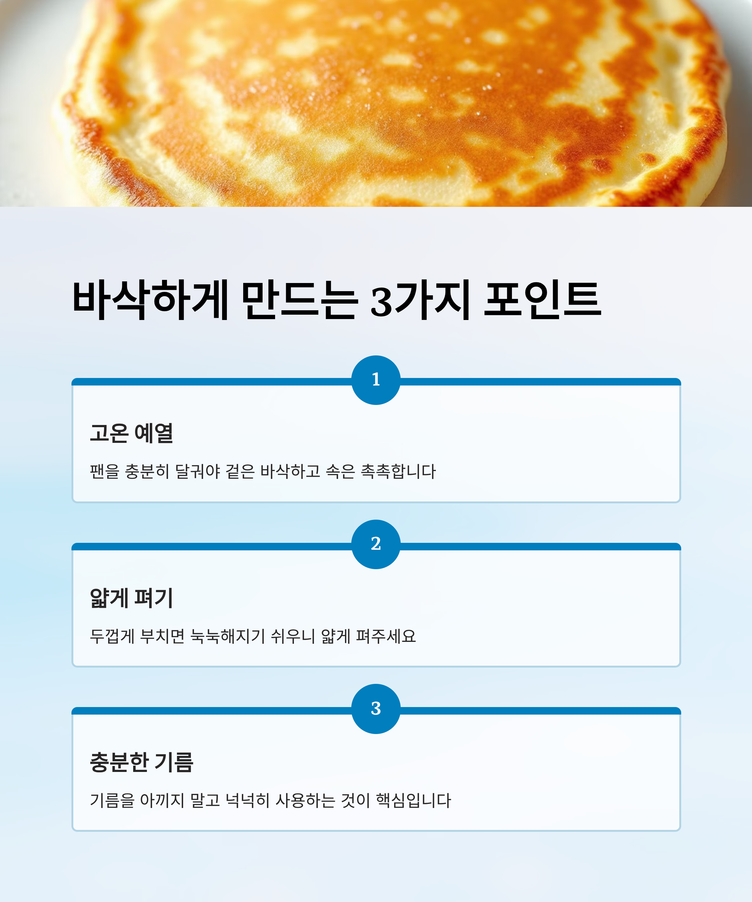 → 고온 예열, 얇게 펴기, 충분한 기름 사용이 바삭함의 포인트!