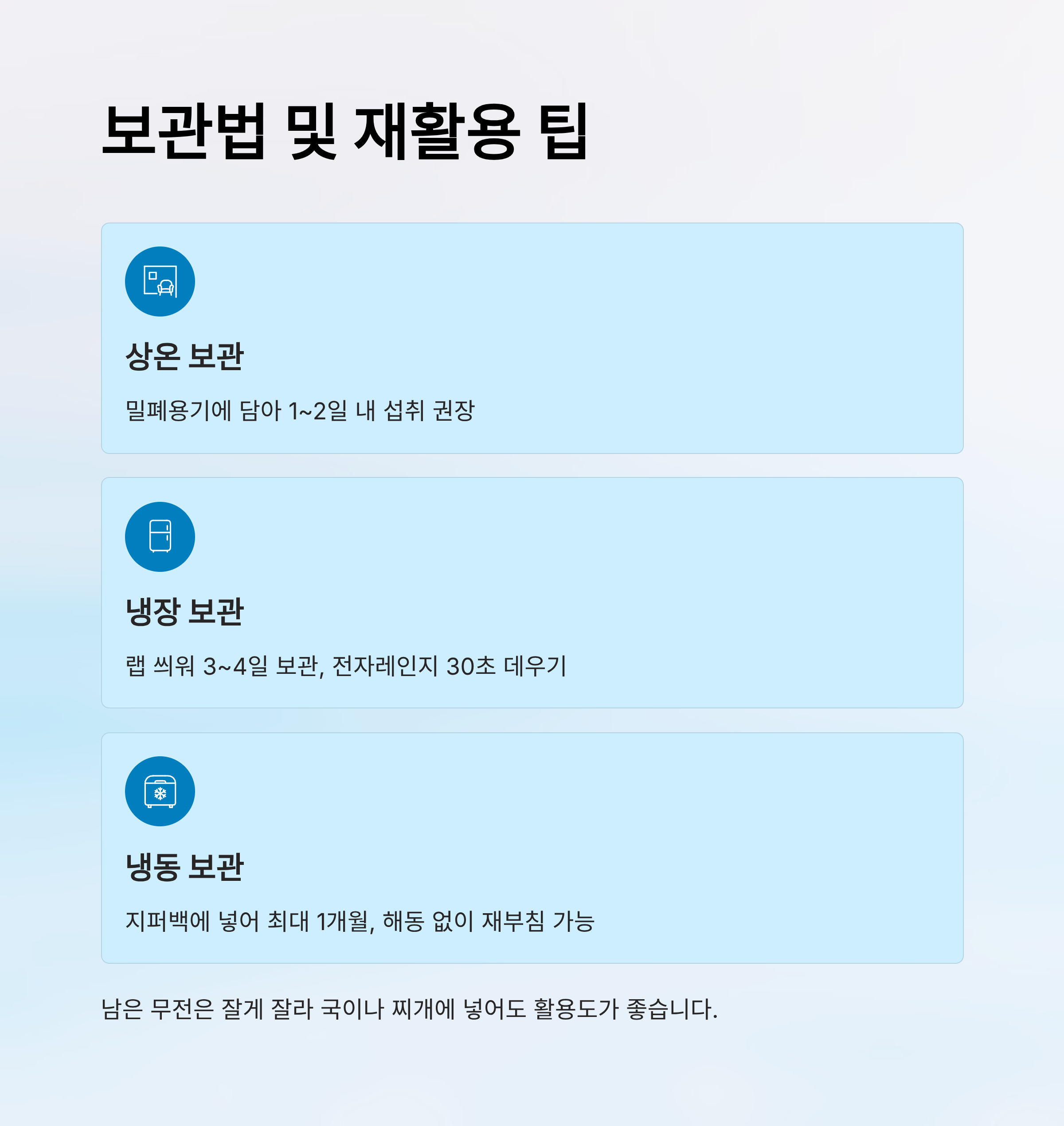 | 냉장 | 랩을 씌워 3~4일 보관, 전자레인지 30초 데우기 |