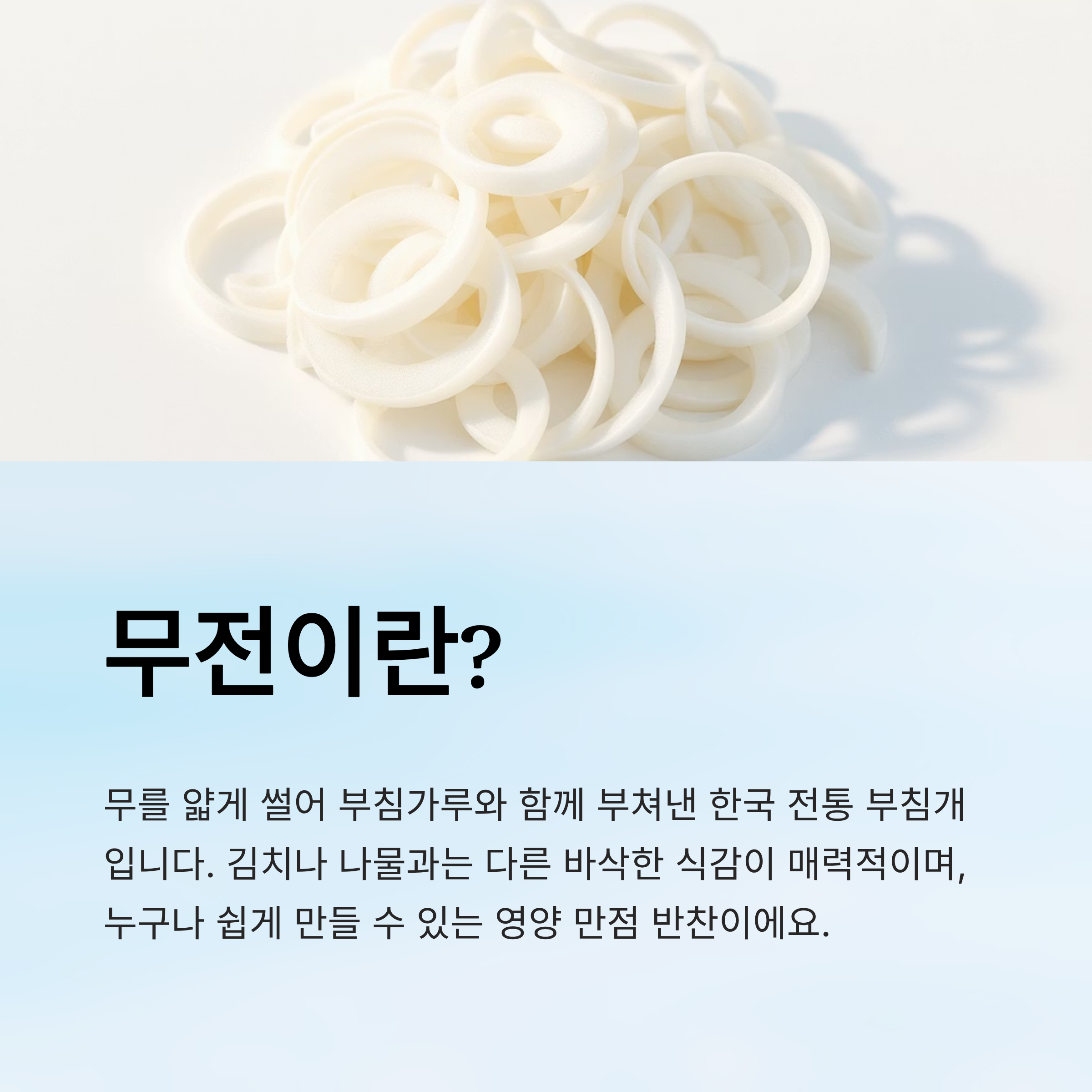 무는 김치나 나물로도 자주 먹지만, 얇게 썰어 부쳐 먹는 무전(무부침개) 또한 간단하고 영양 가득한 반찬입니다. 오늘은 누구나 쉽게 따라 할 수 있는 무전 만드는 법과 함께, 바삭하게 부치는 핵심 노하우까지 정리해 드릴게요.
