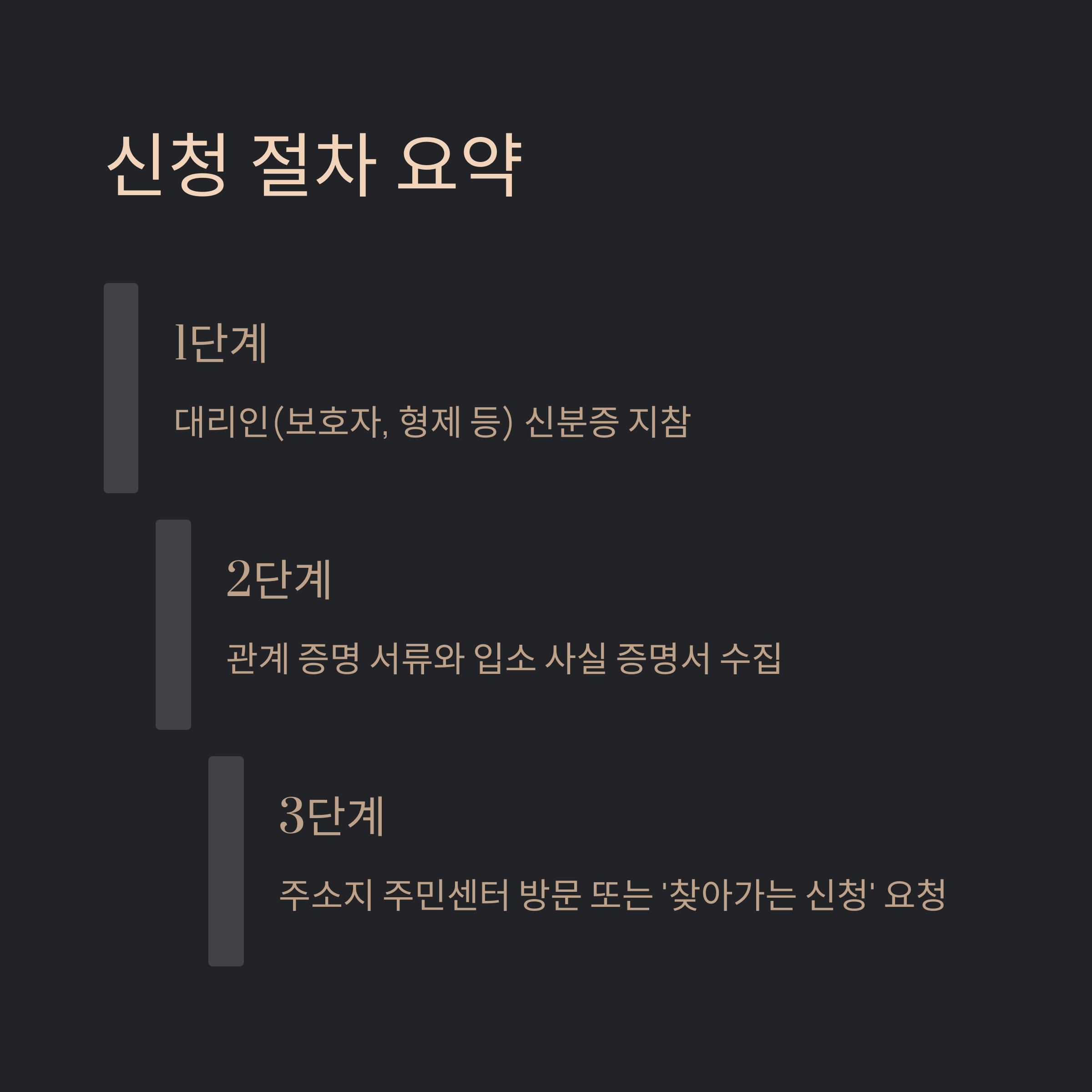 이 서류를 지참해 주민등록상 주소지 관할 주민센터에 방문해 접수하세요.