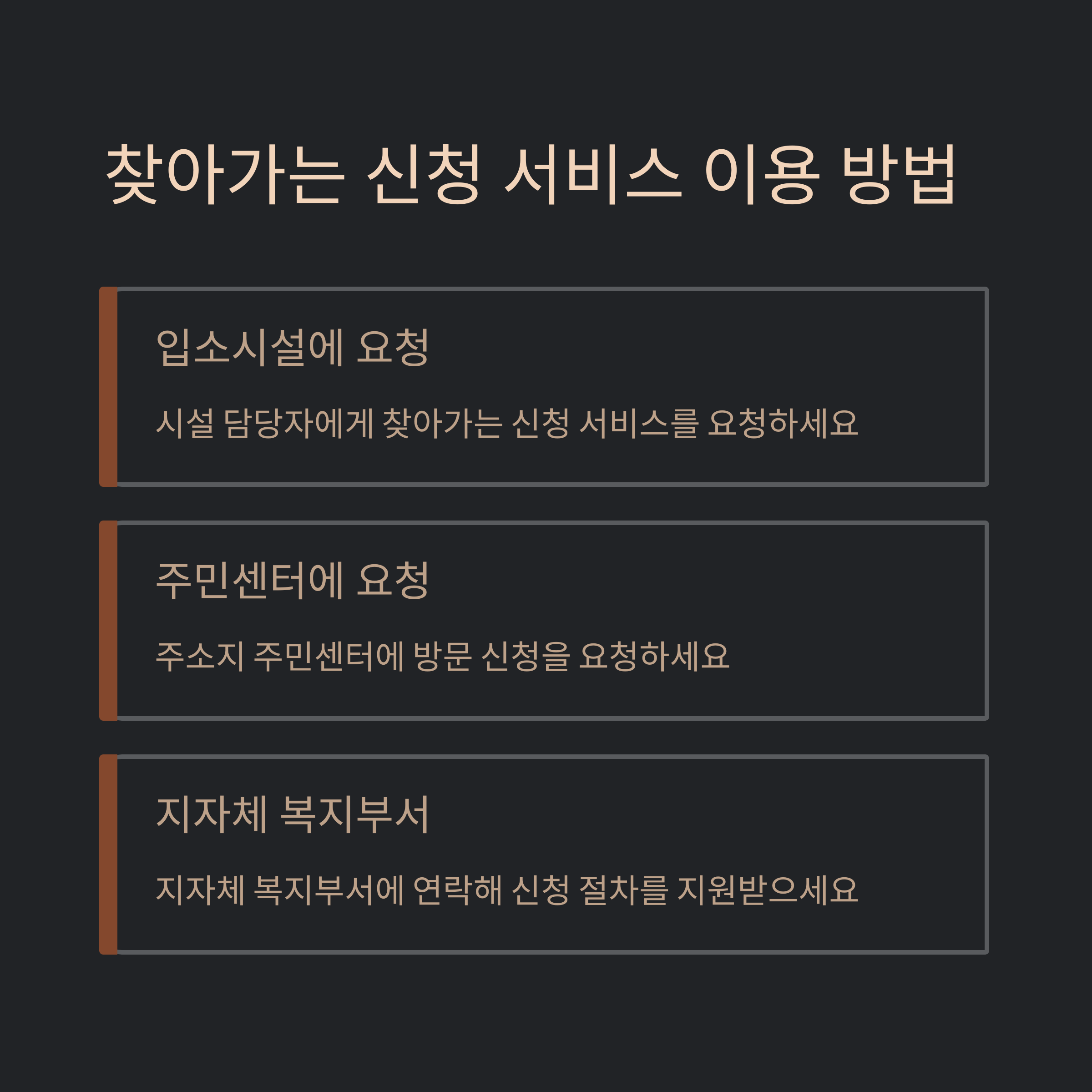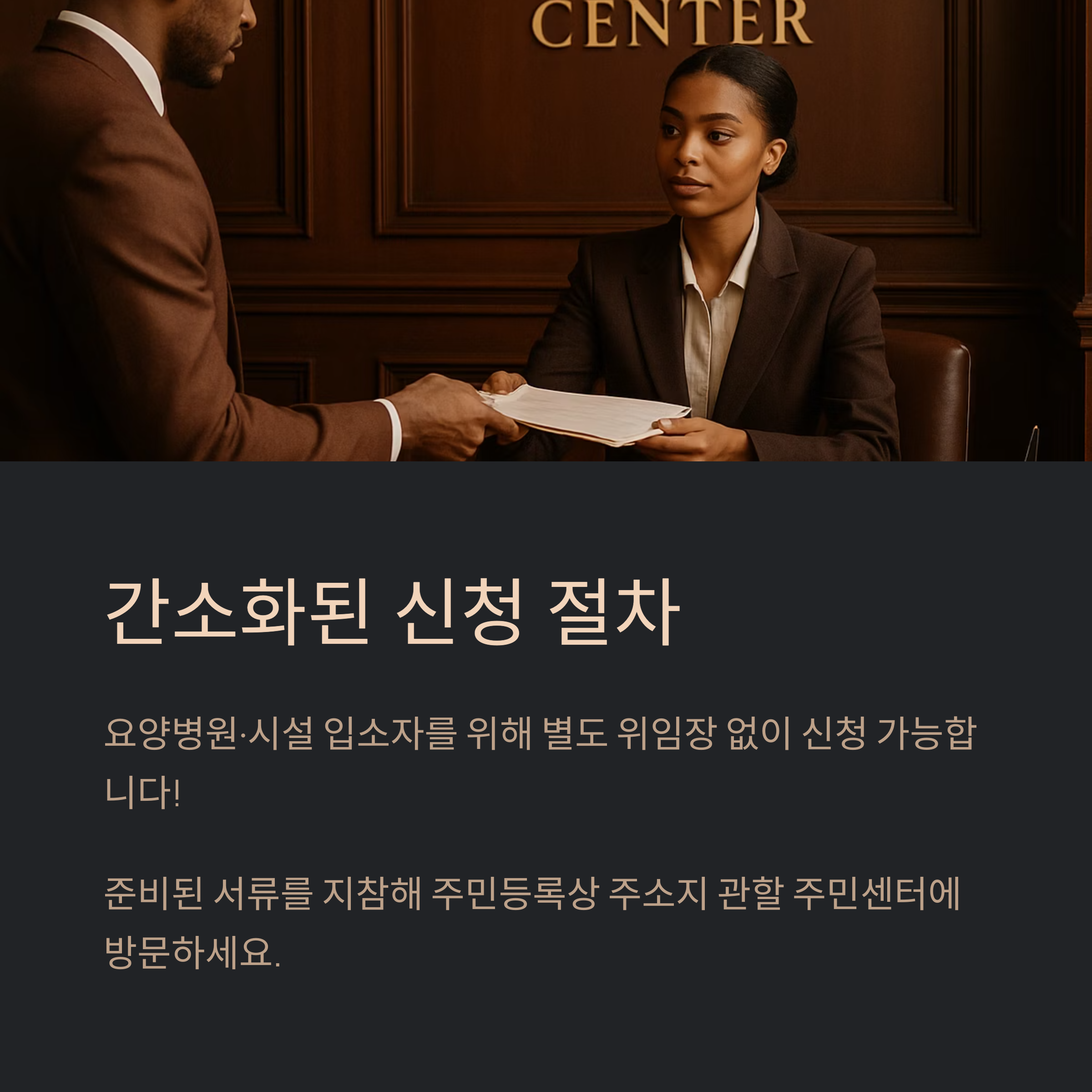 - 본인 직접 신청: 건강 상태가 허락되면, 입소지 주소지의 주민센터에서 본인이 신청할 수 있습니다.