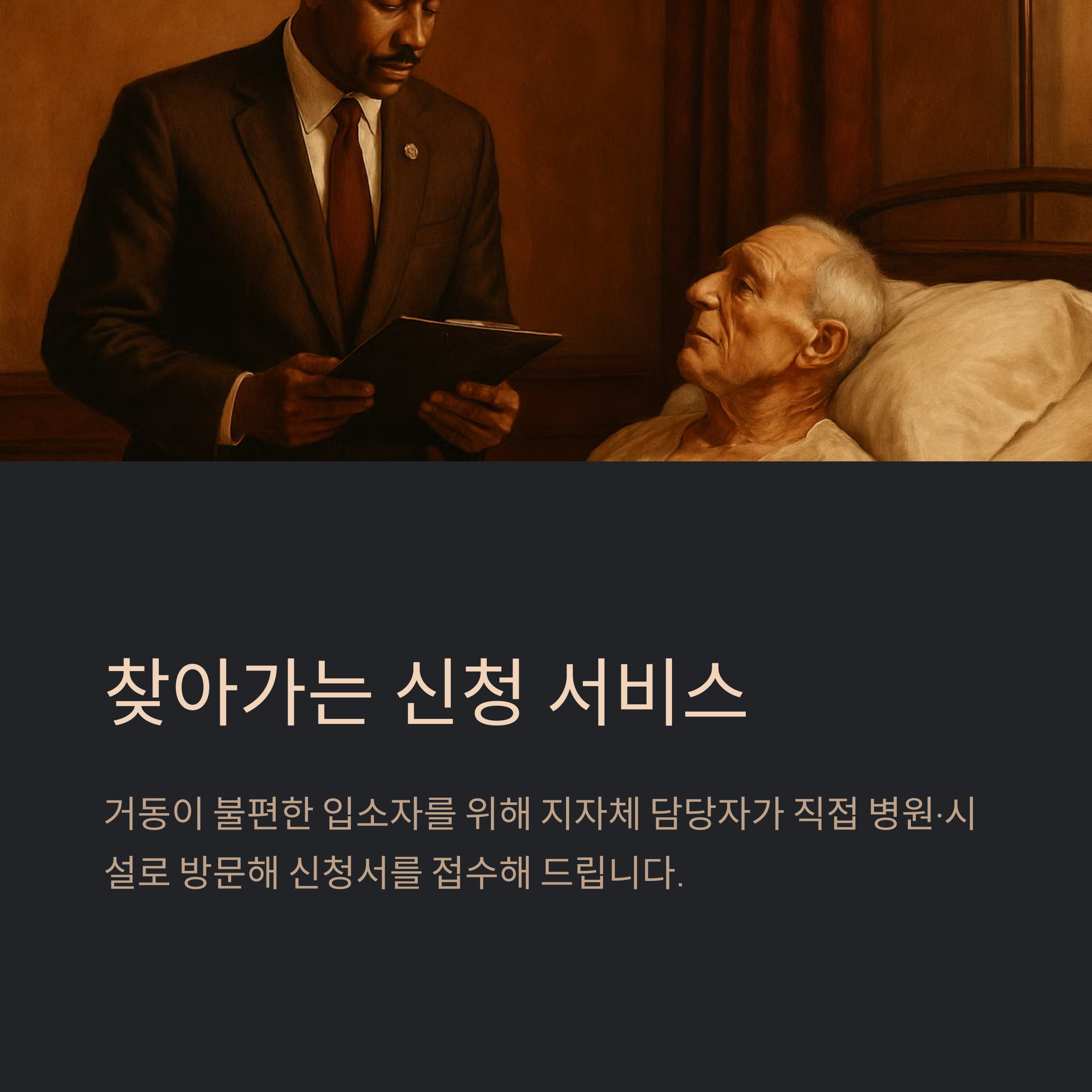 - 거동이 불편한 입소자를 위해 지자체 담당자가 직접 병원·시설로 방문해 신청서를 접수하는 “찾아가는 신청” 제도도 운영됩니다.