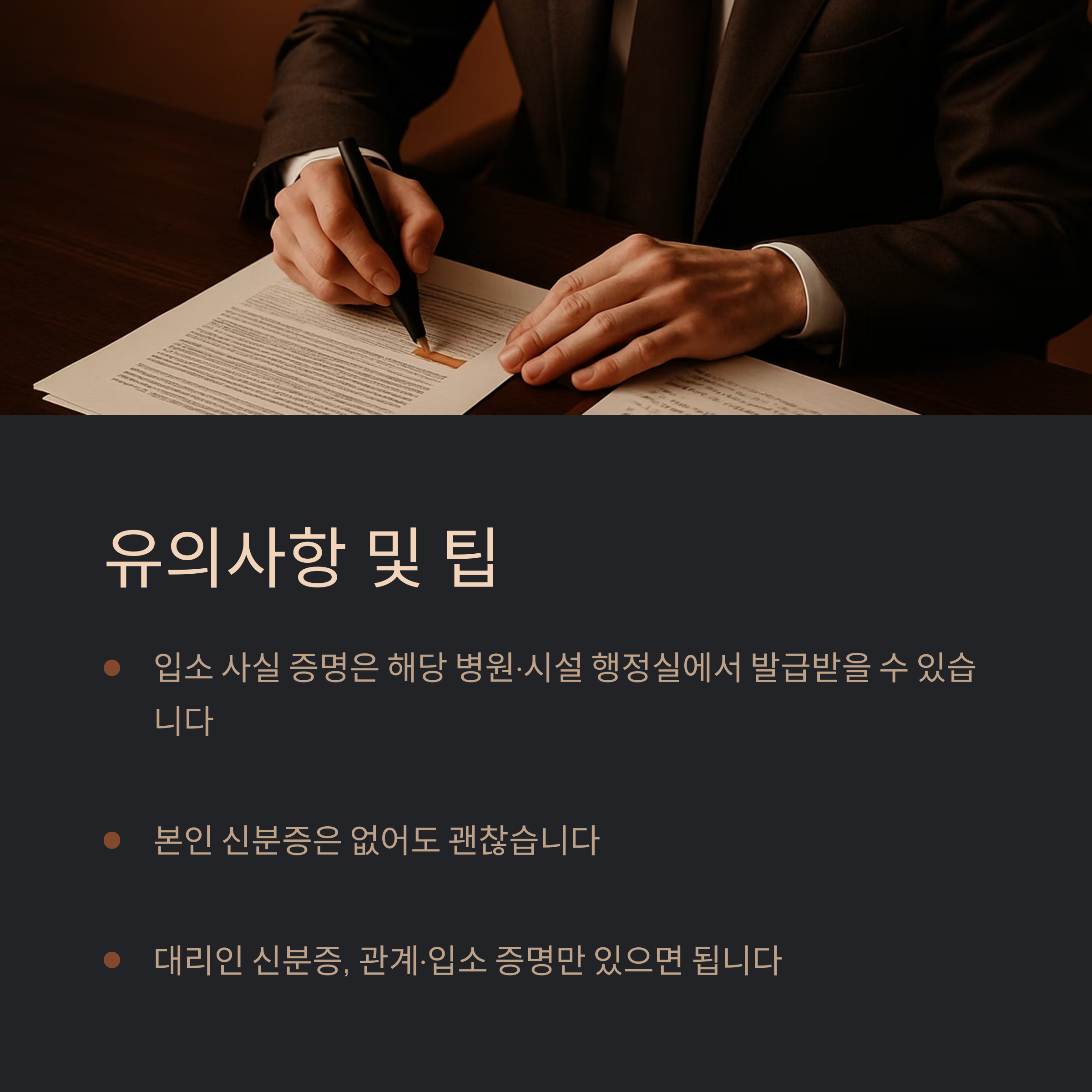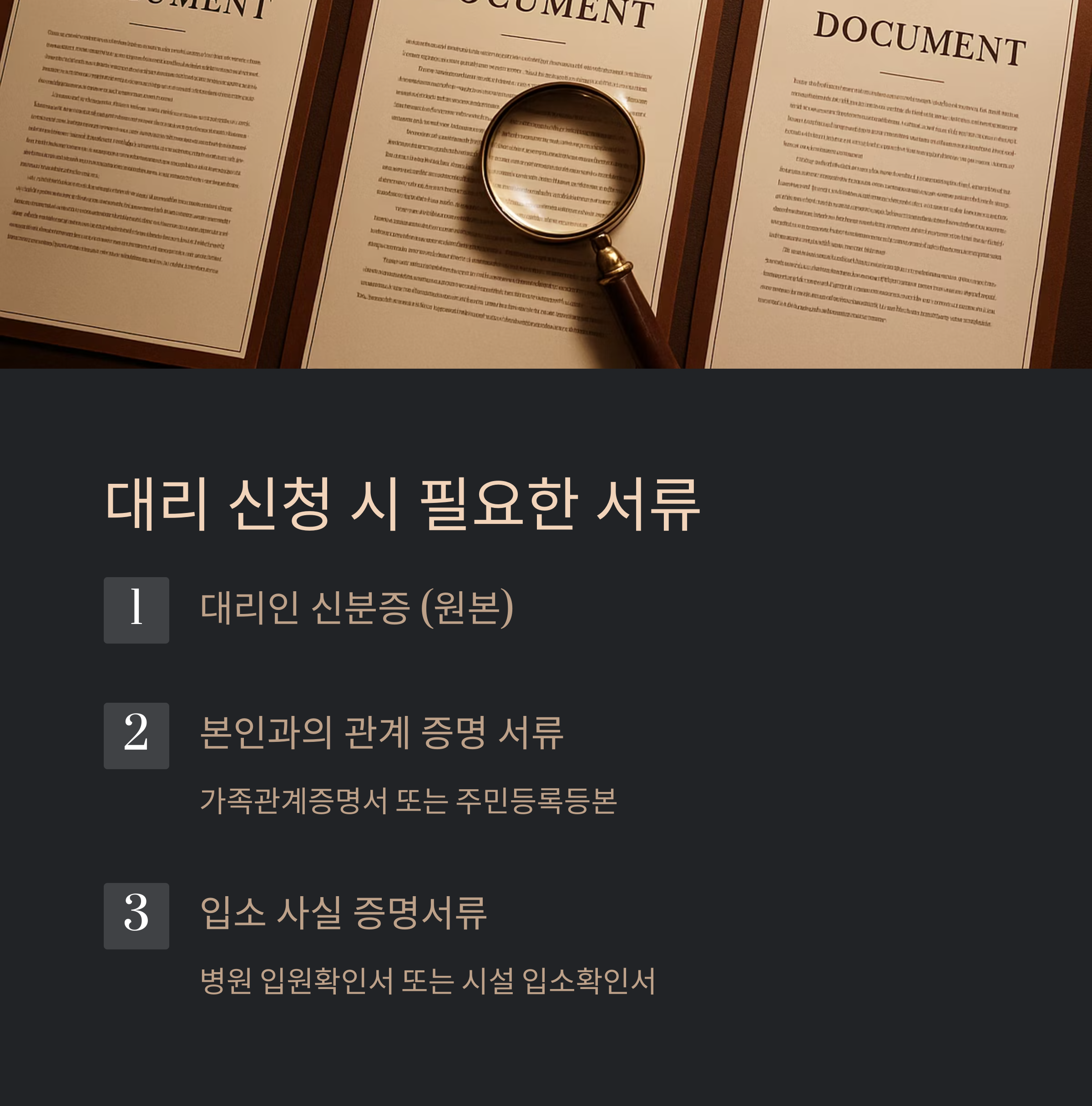 - 본인 신분증은 없어도 괜찮습니다. 대리인 신분증, 관계·입소 증명만 있으면 됩니다.