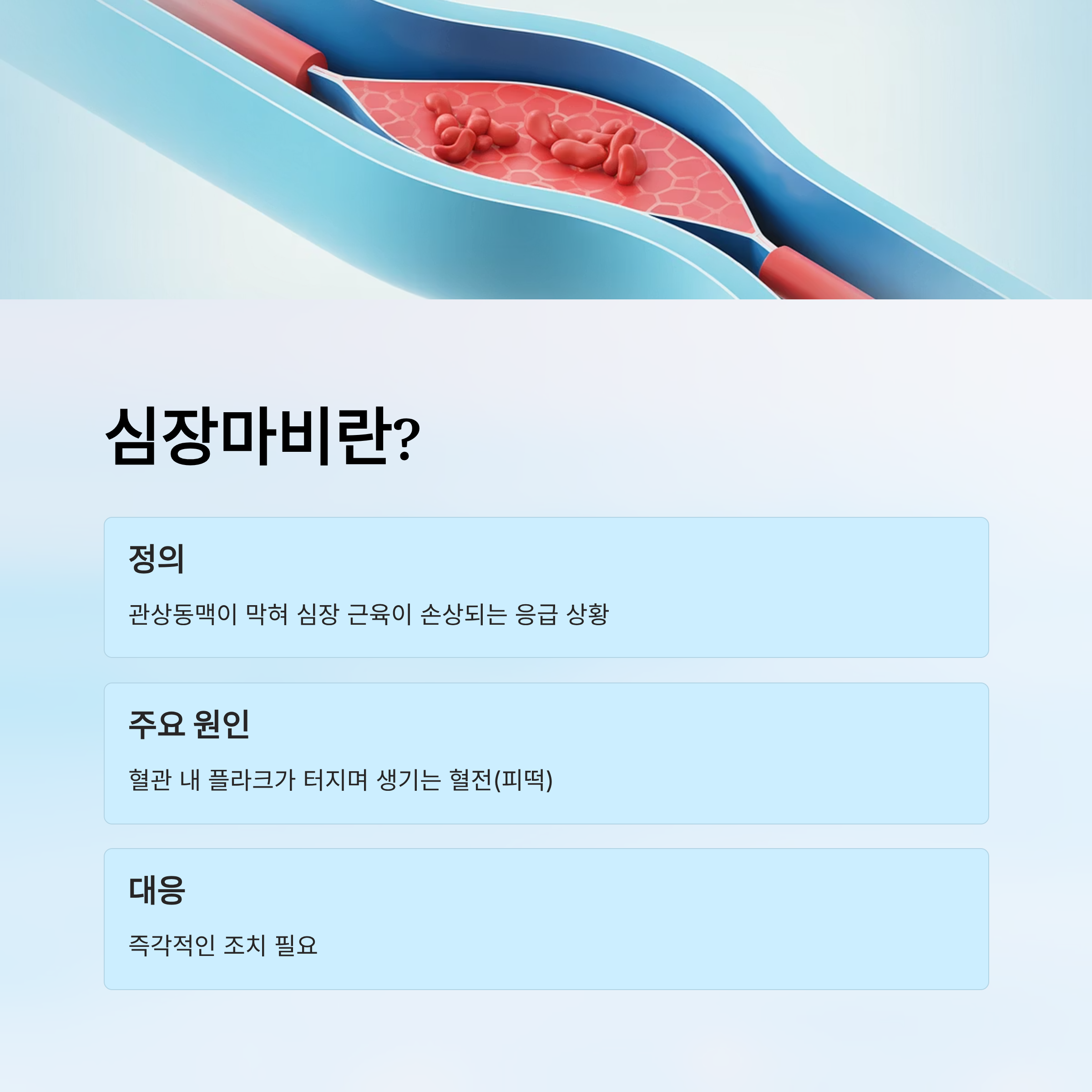 심장마비(심근경색)는 심장에 혈액을 공급하는 관상동맥이 갑자기 막혀 심장 근육이 손상되거나 죽는 상태입니다. 주요 원인은 "혈관 안의 플라크가 터지면서 생기는 혈전(피떡)"입니다. 이는 응급 상황이므로 즉각적인 조치가 필요합니다.