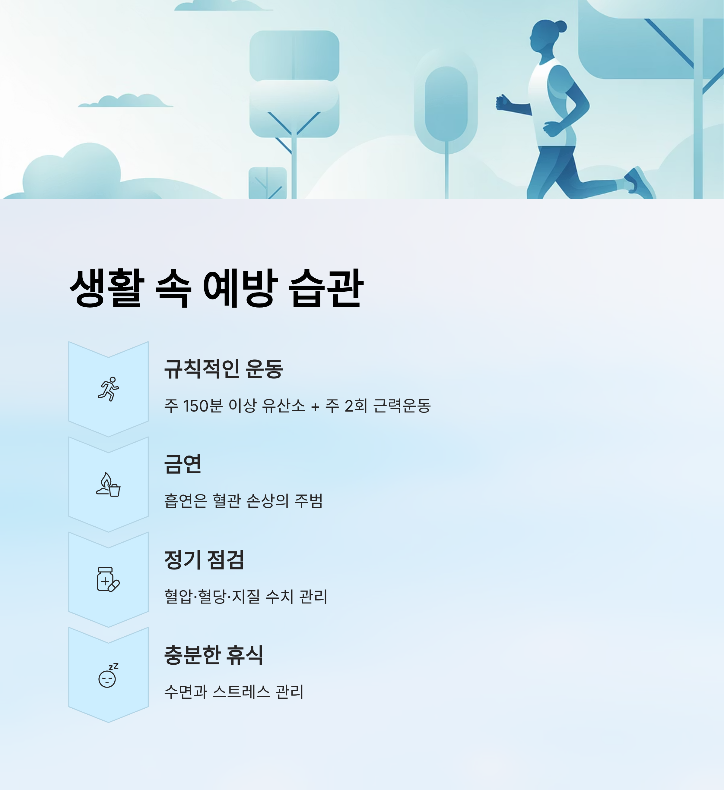 - 규칙적인 운동: 주 150분 이상 유산소 운동 + 주 2회 근력운동