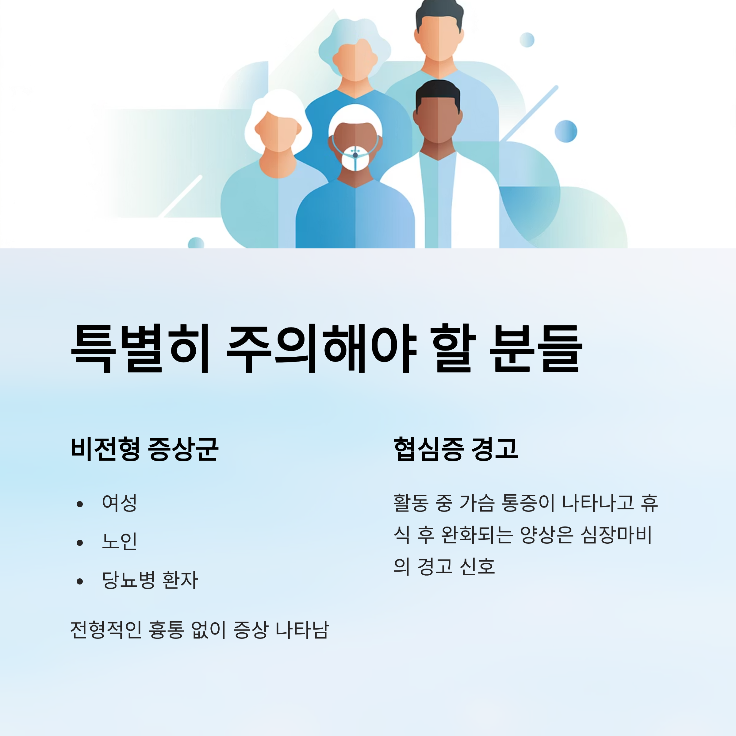 특히 여성, 노인, 당뇨병 환자는 전형적인 흉통 없이 증상이 나타나므로 주의가 필요합니다. '소화불량인가?' 착각하기 쉬운 증상도 경계해야 합니다.