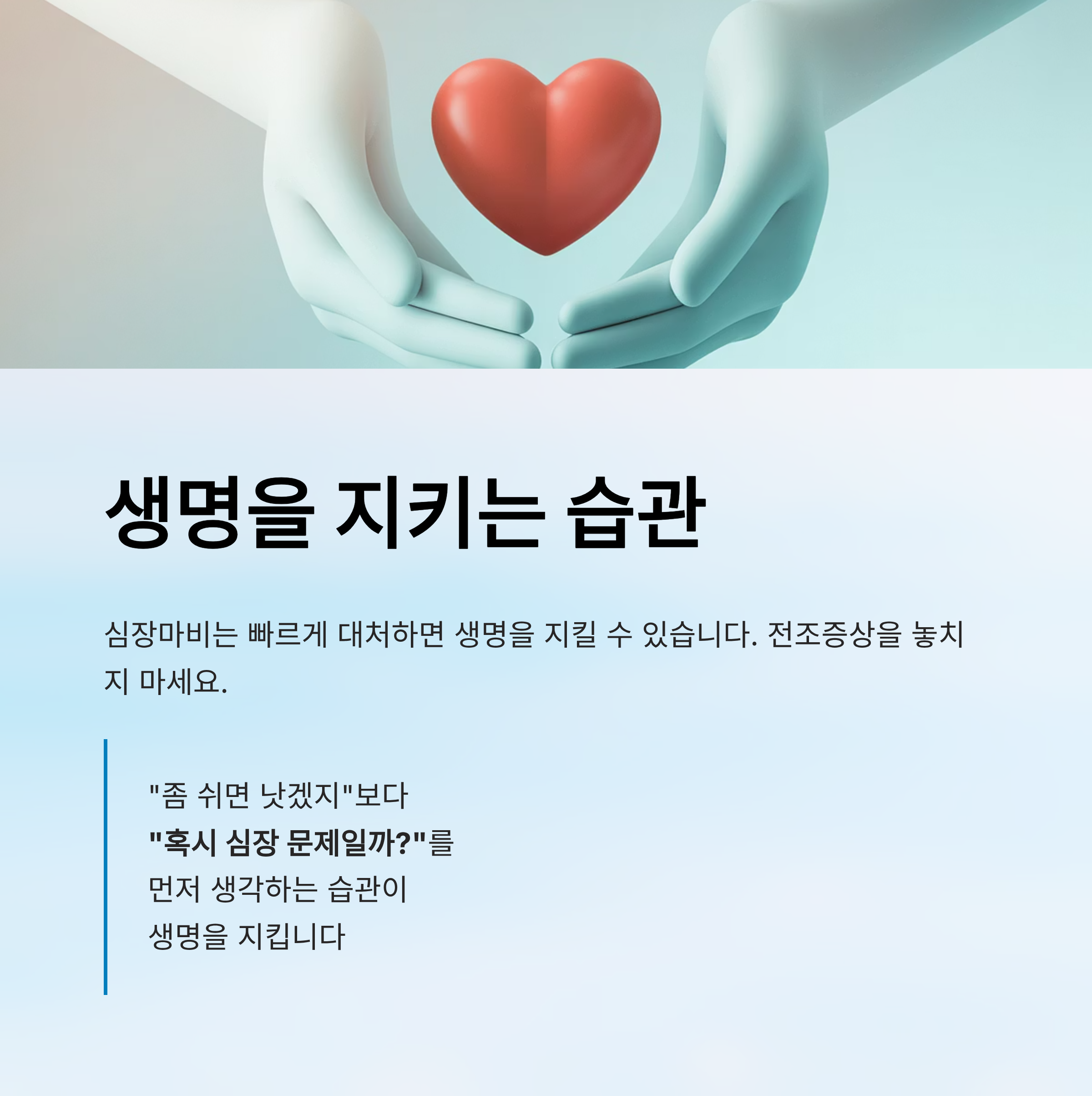 심장마비는 빠르게 대처하면 생명을 지킬 수 있지만, 전조증상을 놓치면 치명적인 결과로 이어질 수 있습니다. 오늘 안내해드린 내용을 바탕으로 위험 요인을 조기에 파악하고, 식습관과 생활습관을 점검해보세요.