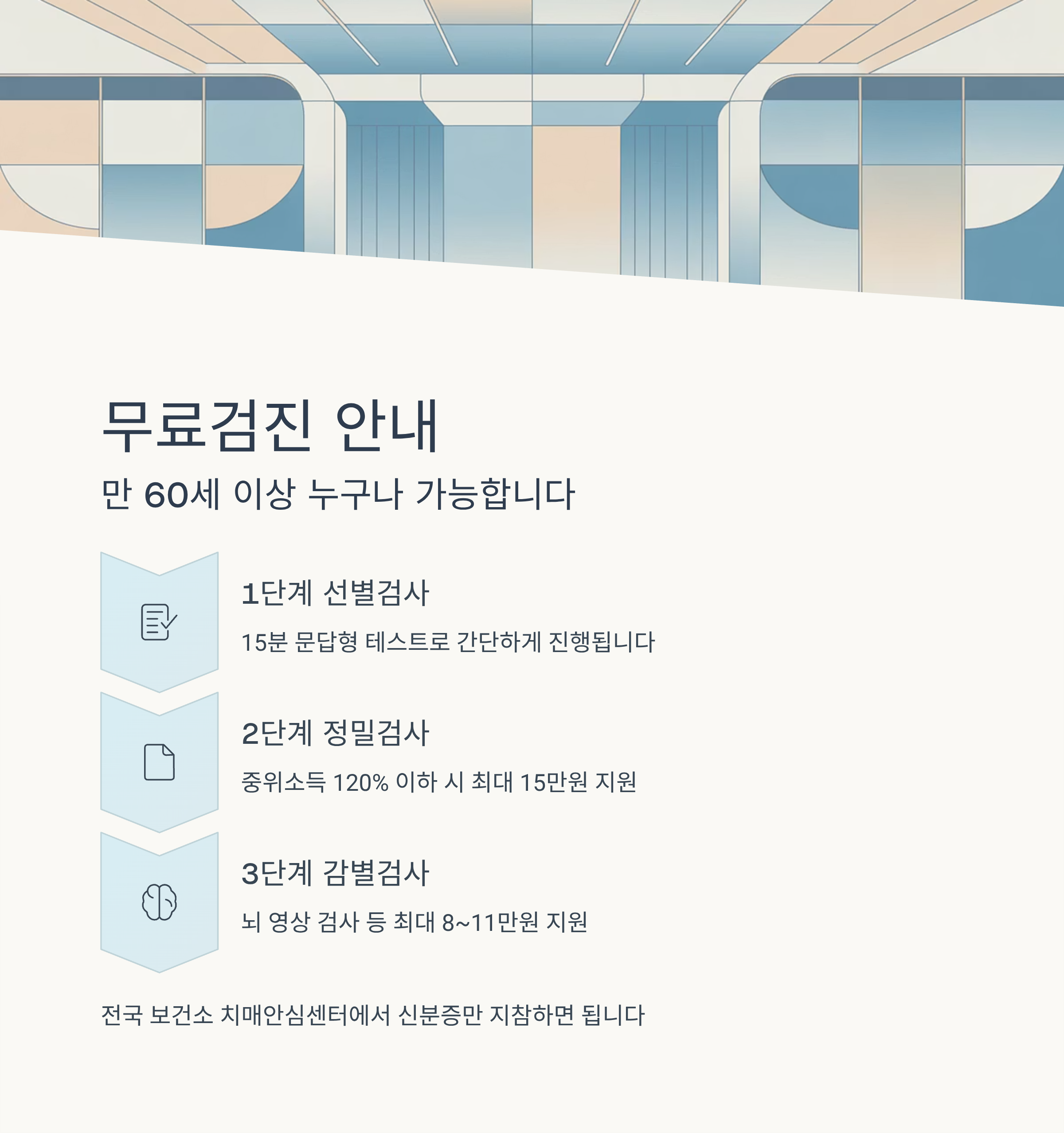 전국 보건소 치매안심센터에서는 신분증만 지참하면 아래 절차로 무료검진이 가능합니다.