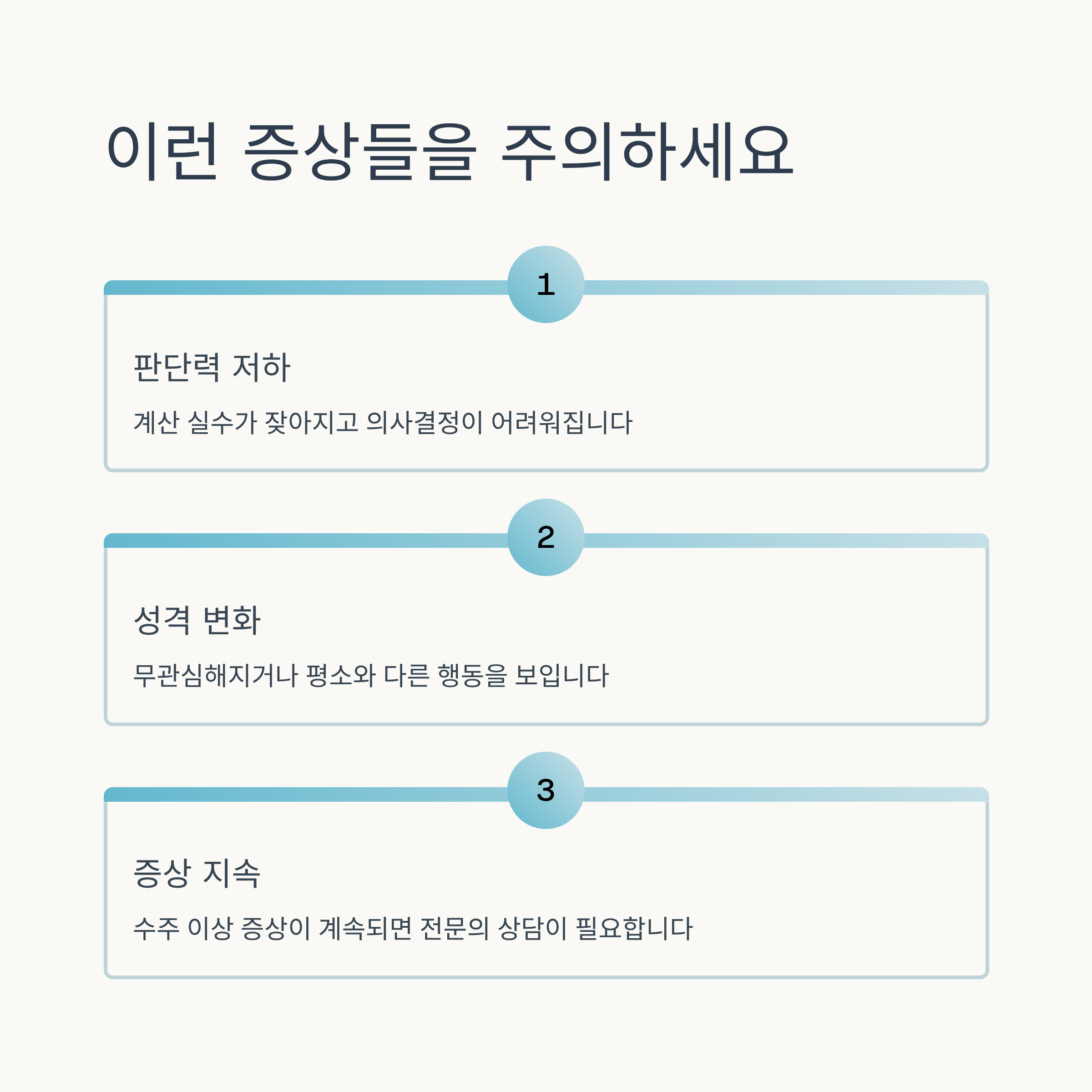 다음과 같은 증상이 자주 반복된다면 치매 초기일 수 있습니다.