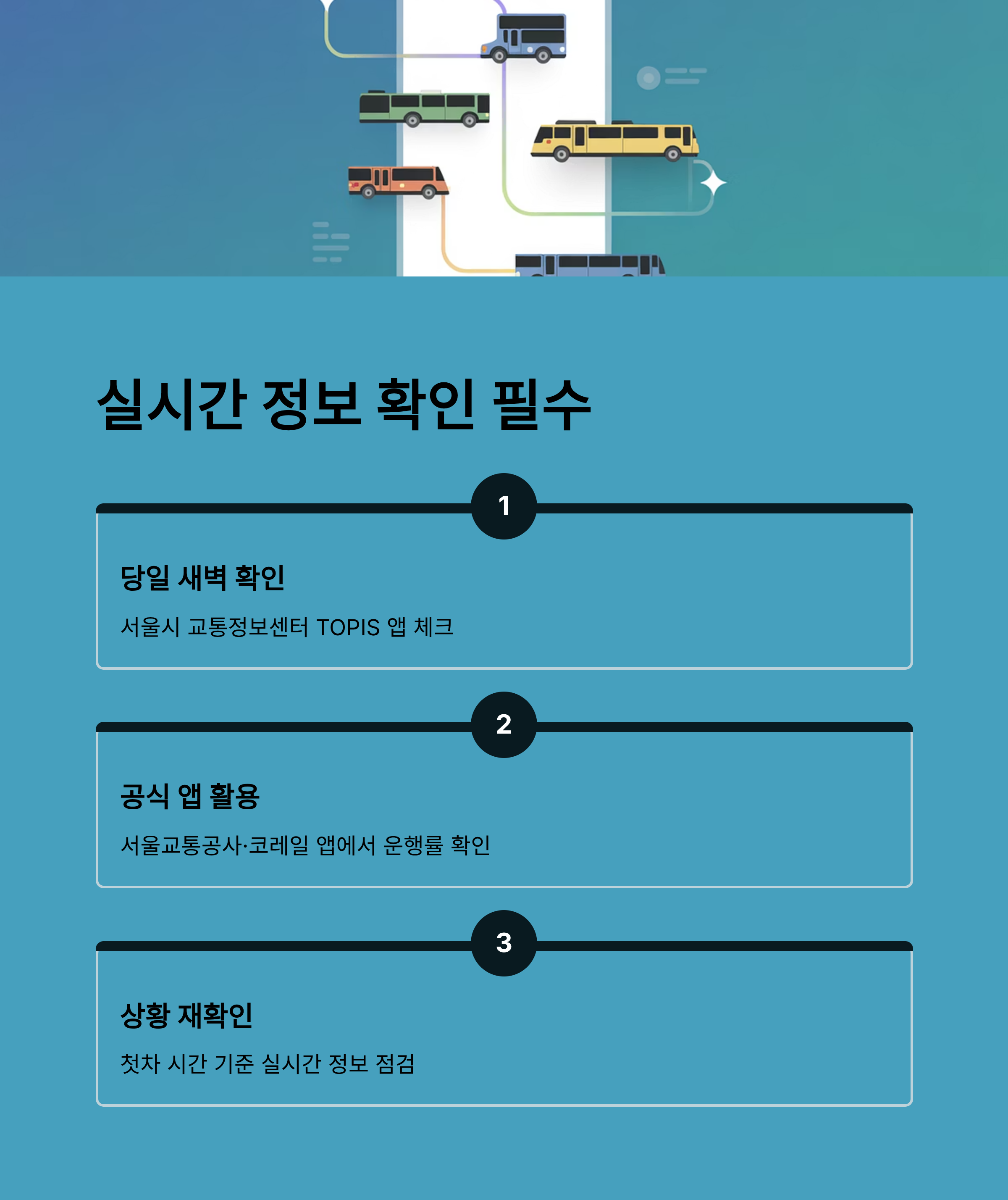→ 서울시 교통정보센터(TOPIS), 서울교통공사·코레일 앱 확인 - 출퇴근 전략