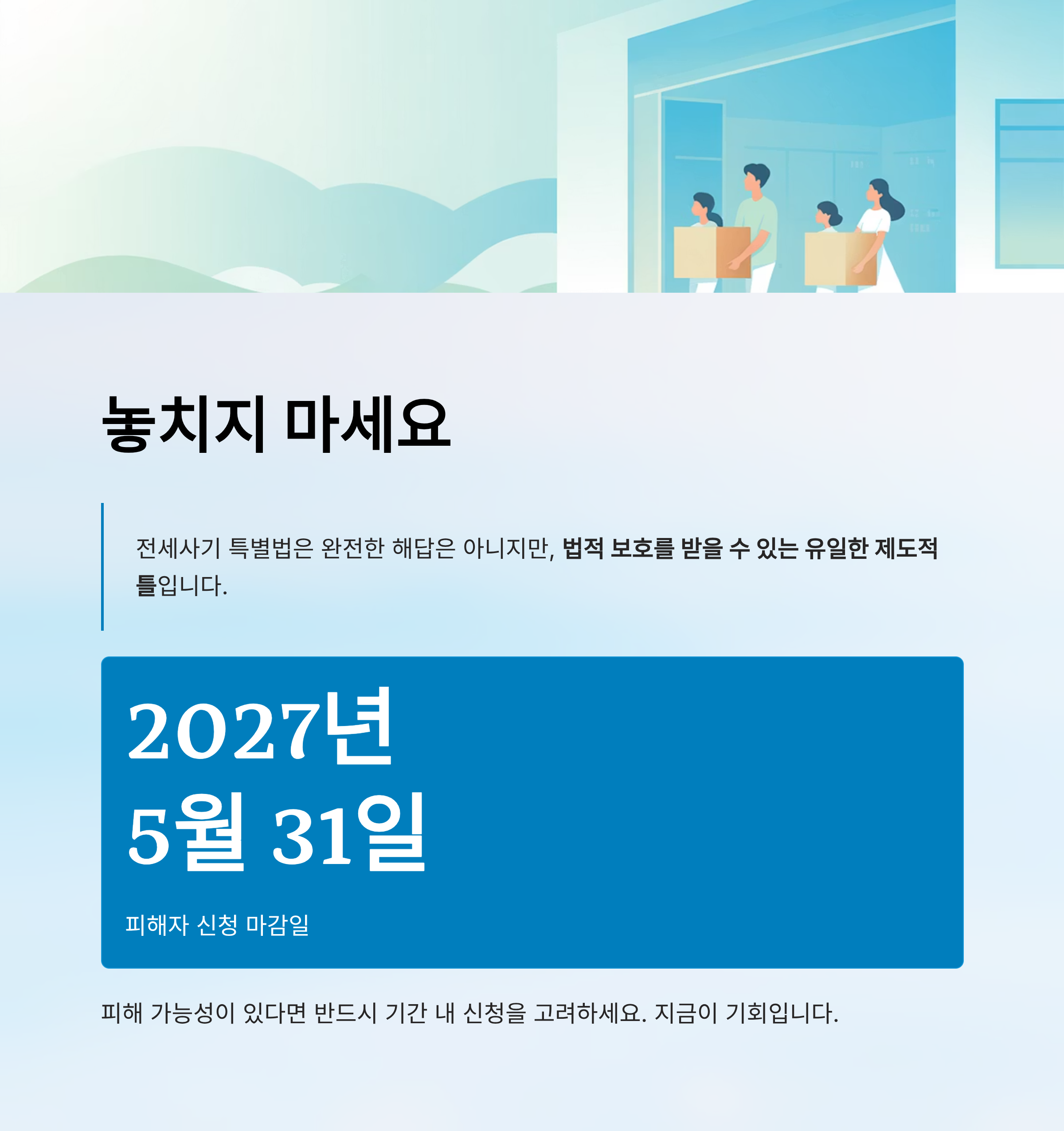 전세사기 특별법은 여전히 ‘완전한 해답’은 아닙니다. 그러나 법적 보호를 받을 수 있는 유일한 제도적 틀이기에, 피해 가능성이 있다면 반드시 기간 내 신청을 고려해야 합니다.