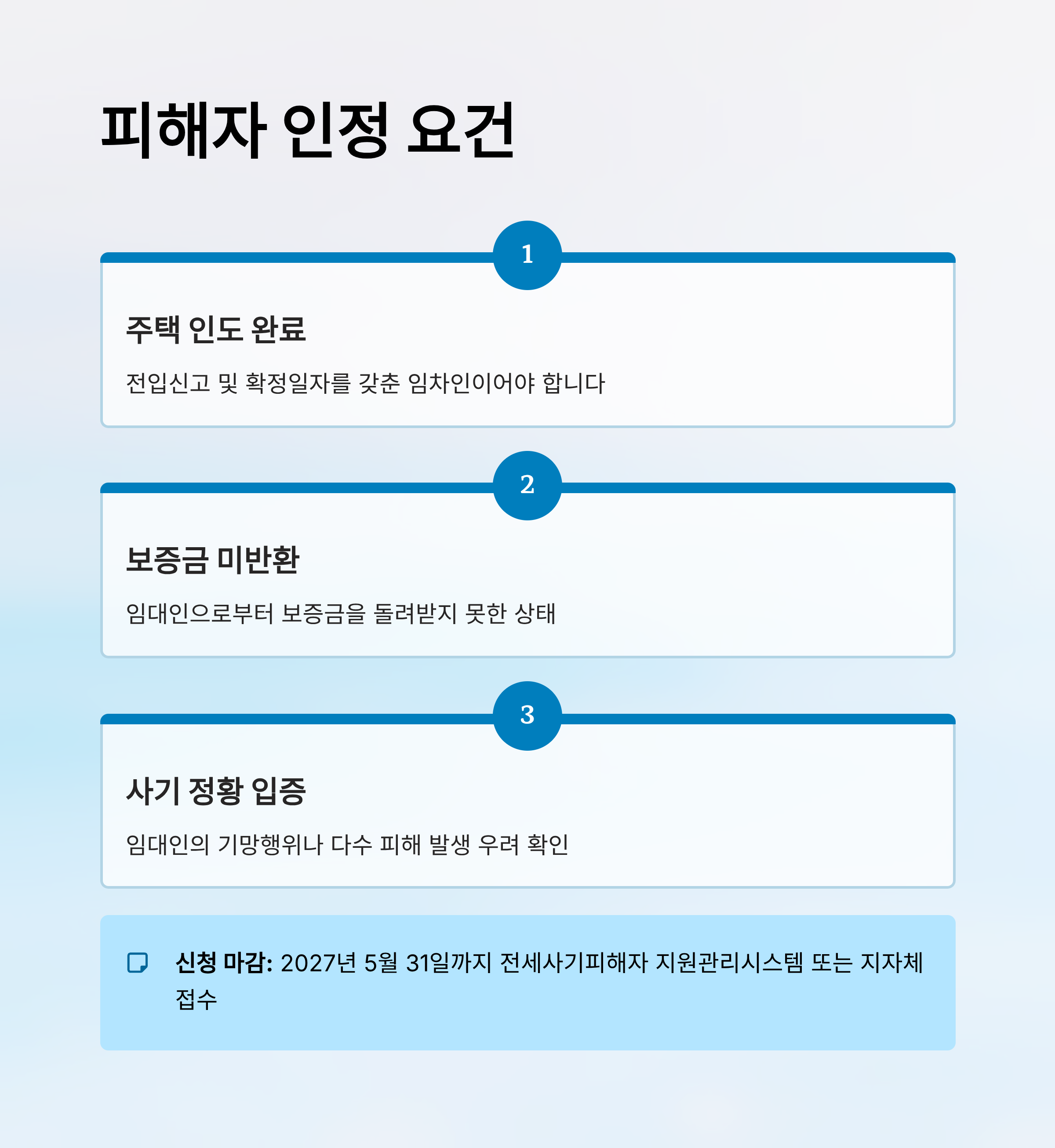 아래 조건을 충족하면 ‘전세사기 피해자’로 인정받을 수 있습니다: