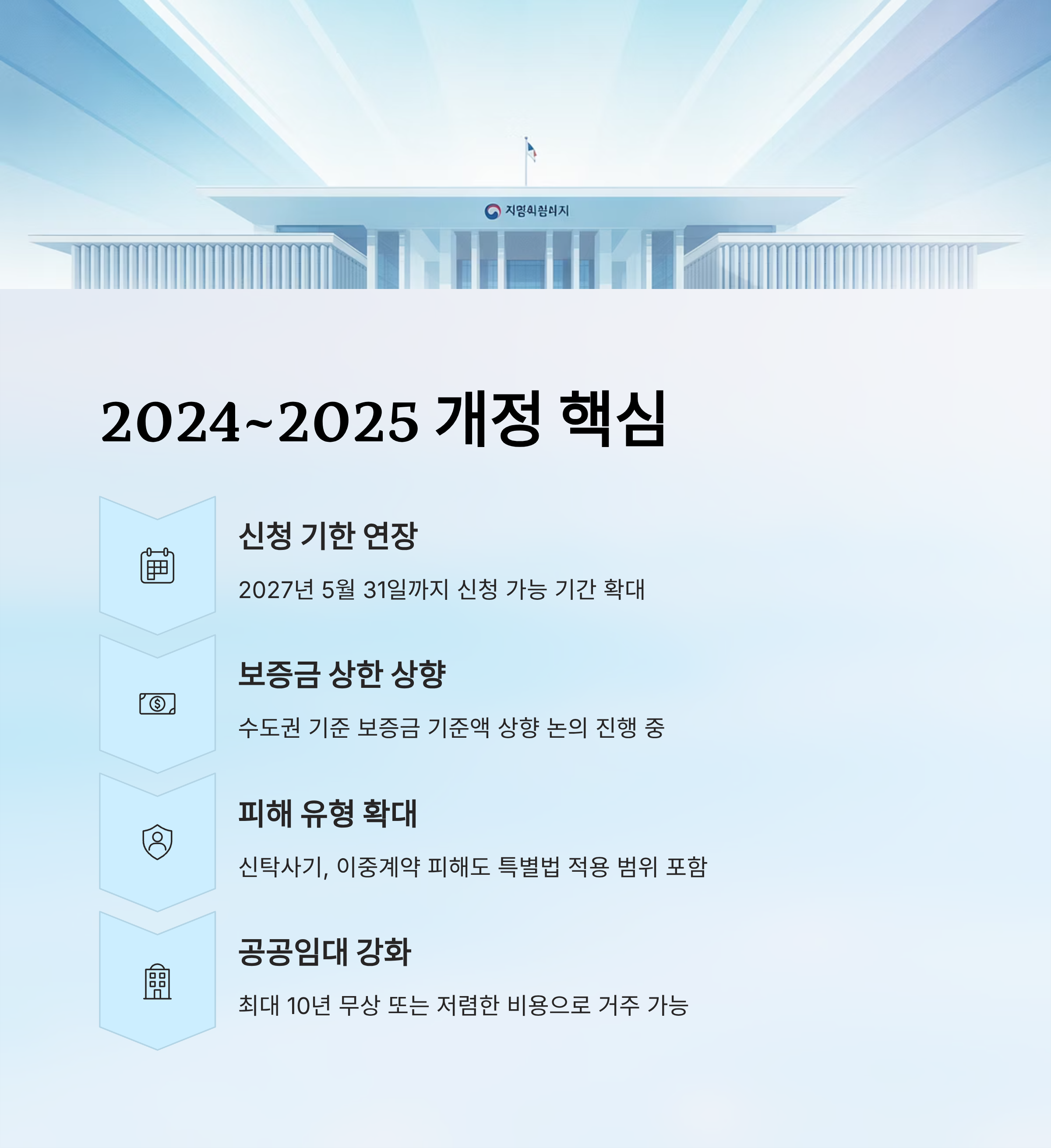 2022년부터 사회적 파장을 일으킨 전세사기 문제에 대응하기 위해 마련된 전세사기피해자 지원 및 주거안정에 관한 특별법(전세사기 특별법)이 2024~2025년 개정을 거치며 적용 기한과 지원 범위가 확대되었습니다. 아직 피해를 구제받지 못한 분들이라면 지금이 기회입니다.
