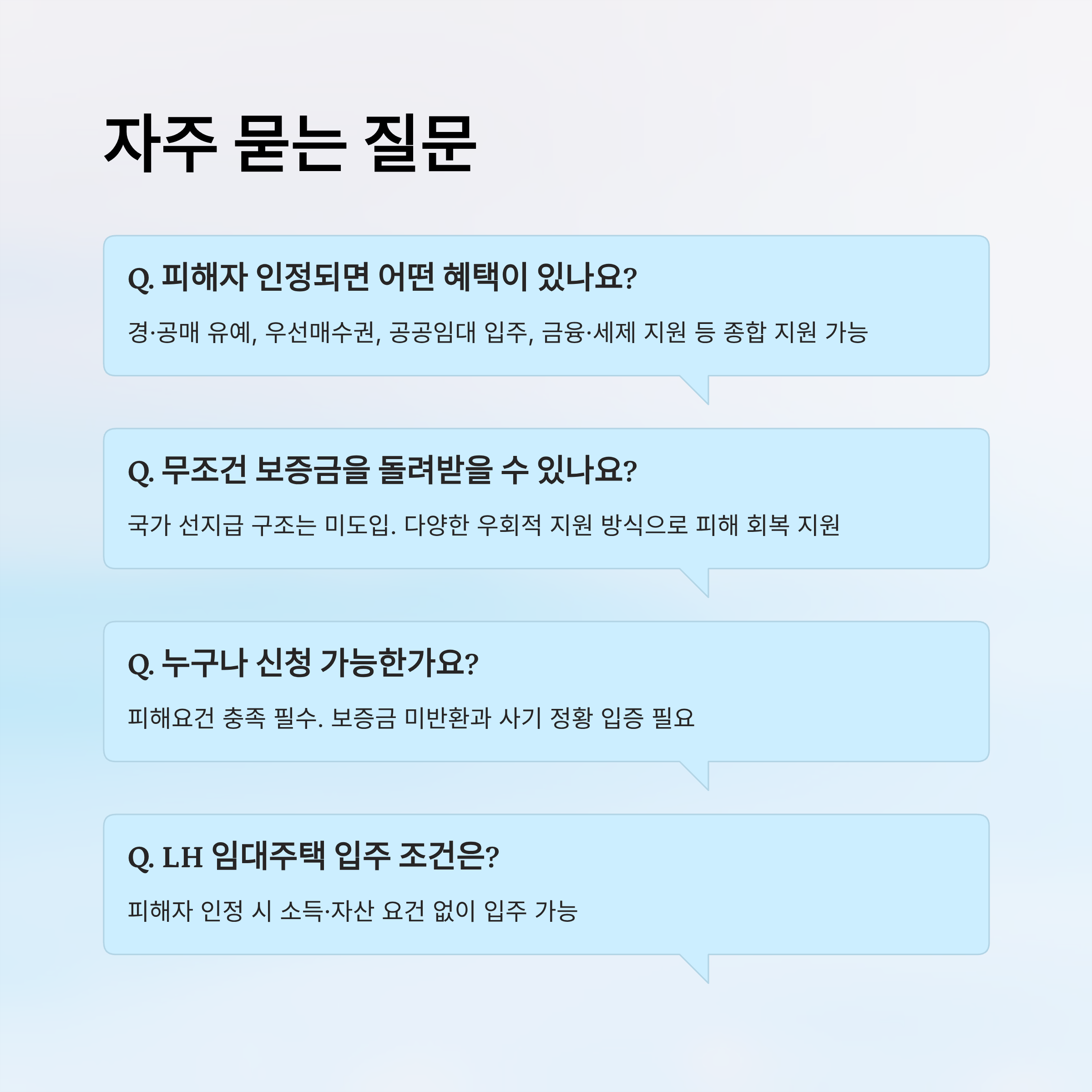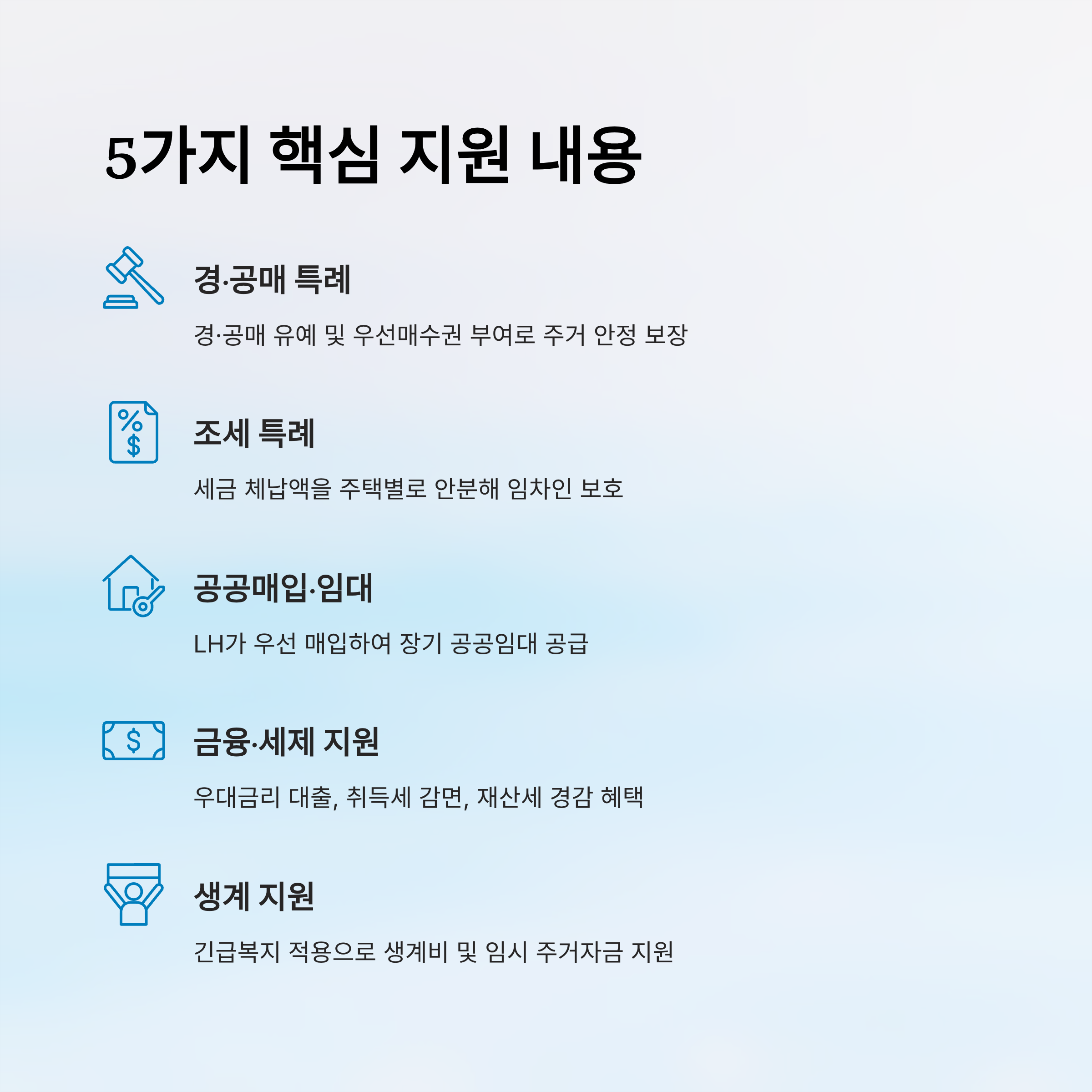A1. 경·공매 유예, 우선매수권, 공공임대 입주, 금융·세제 지원 등 종합 지원이 가능합니다.