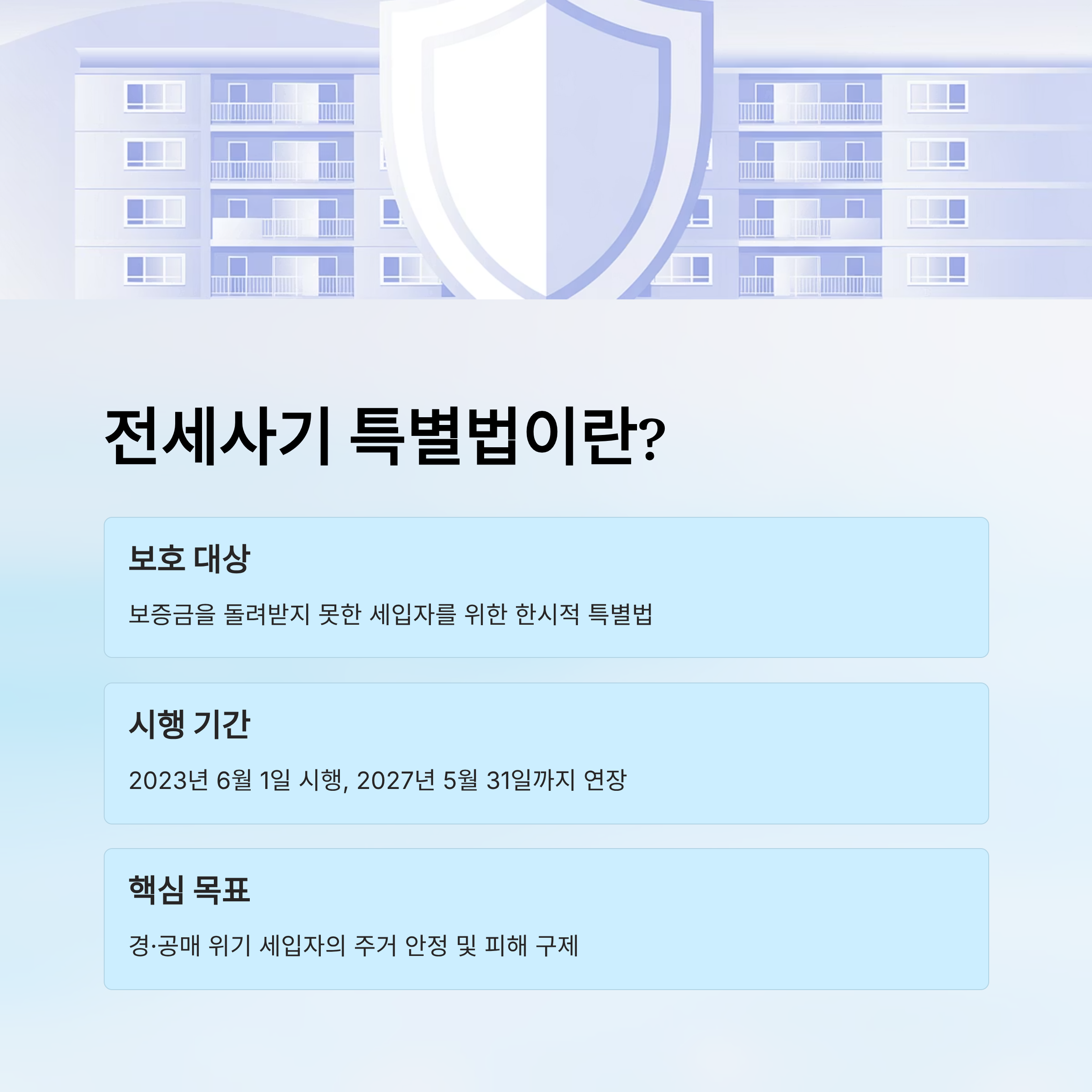 전세사기 특별법은 전세보증금을 돌려받지 못하고 경·공매 위기에 놓인 세입자를 보호하기 위한 한시적 특별법입니다.