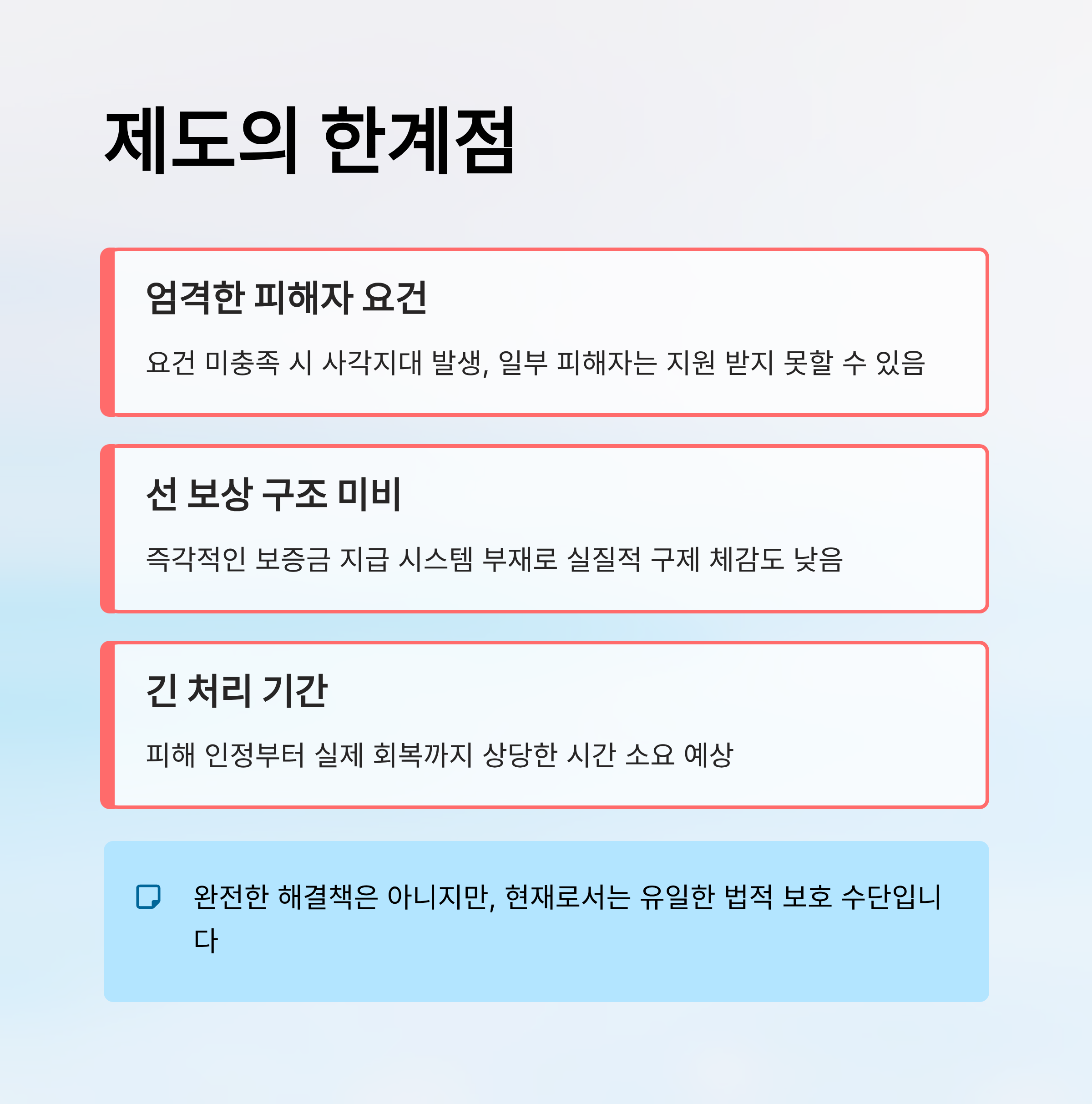 - 피해자 요건이 엄격해 일부는 사각지대 발생