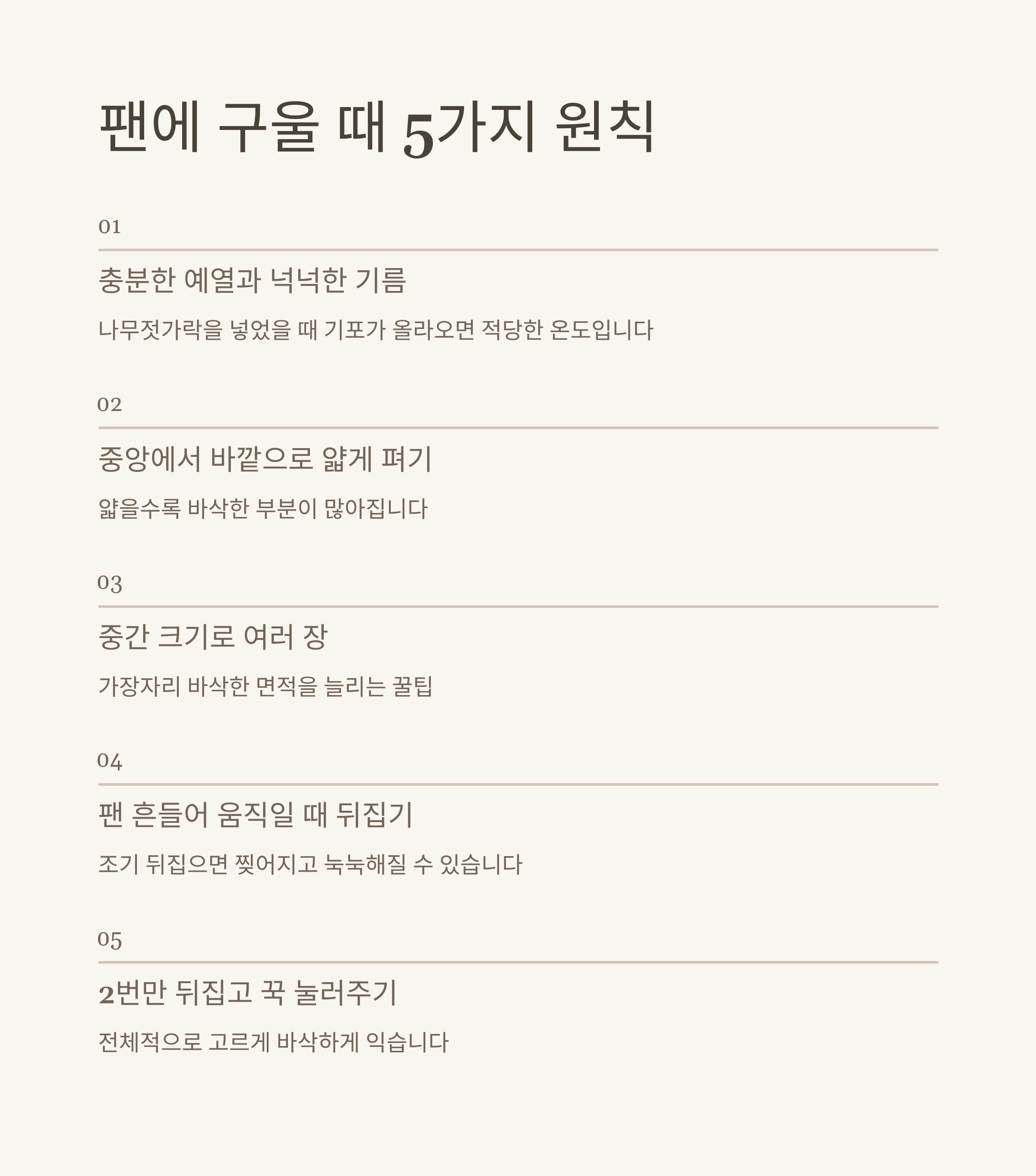 - 기름에 들기름 소량 섞기: 고소함 + 바삭함 상승 (단, 너무 많으면 금방 탈 수 있음)