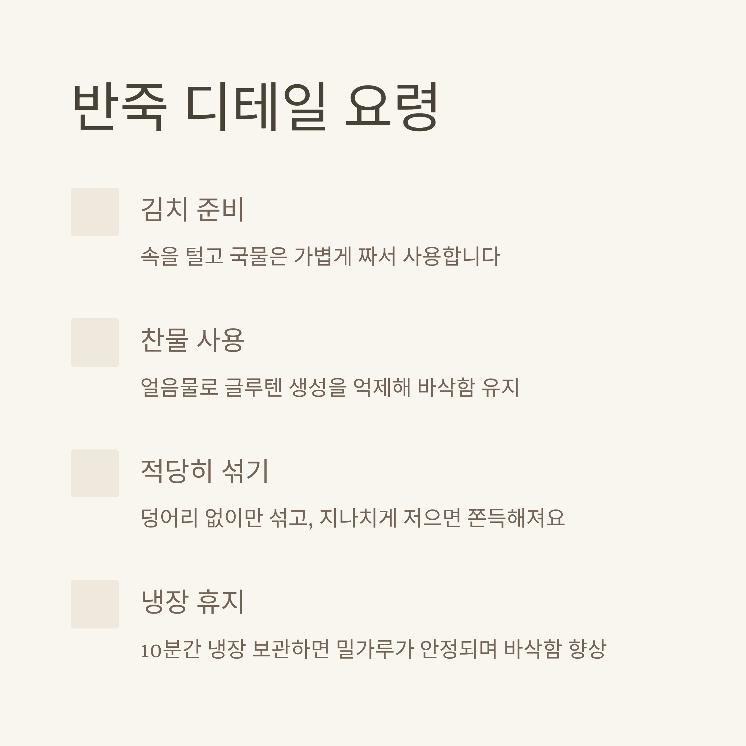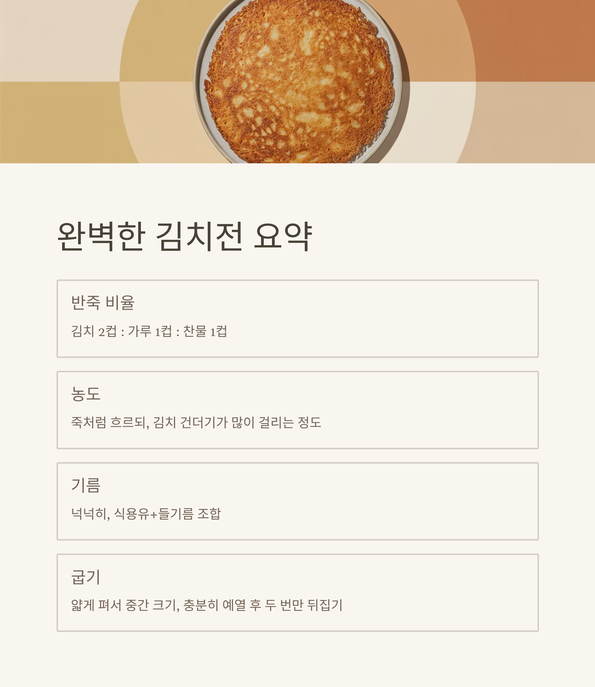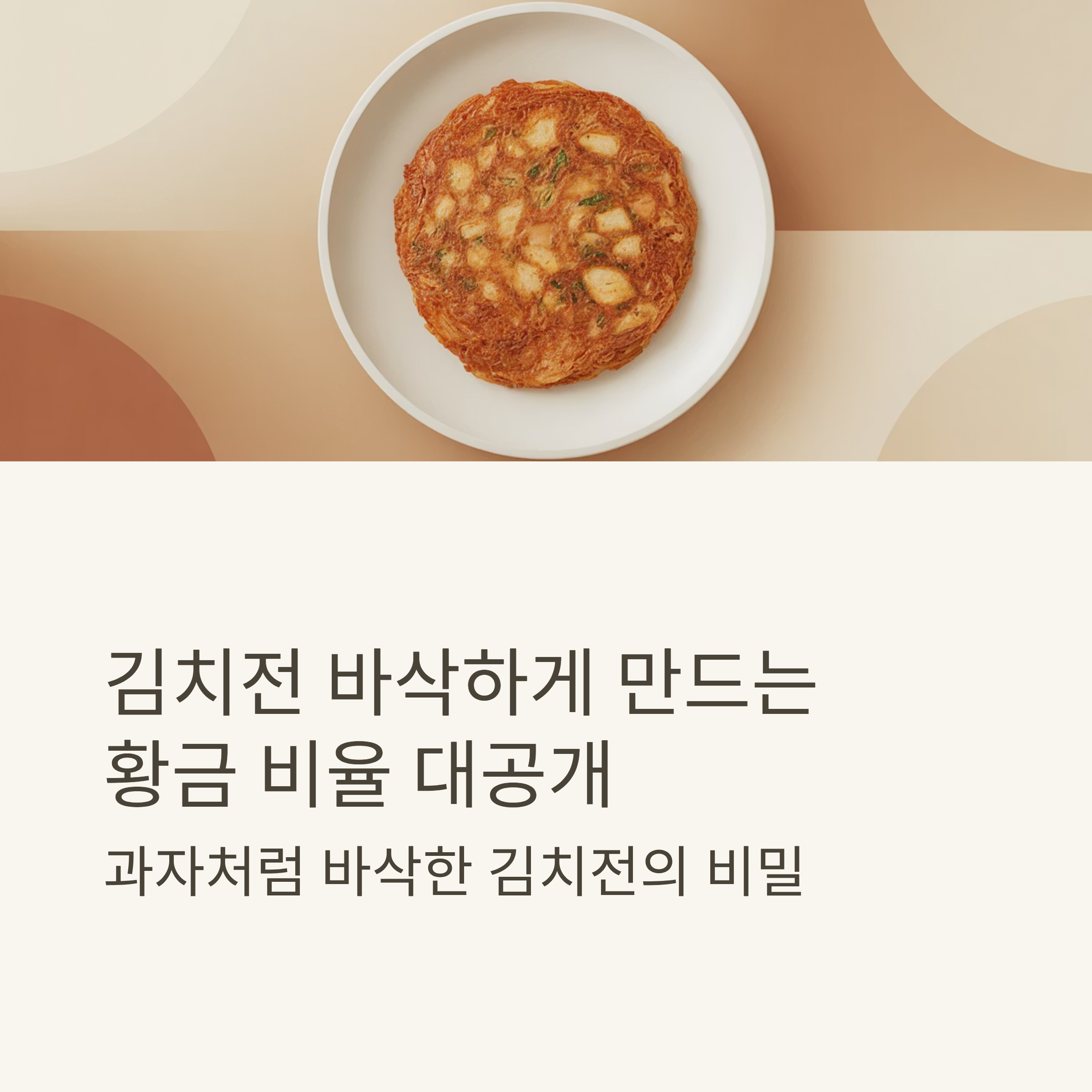 겉바속촉 김치전은 어렵지 않습니다. 위 4가지만 기억하고 실행에 옮기면, 집에서도 과자처럼 바삭한 김치전을 맛있게 즐길 수 있습니다. 실패 없는 황금 비율로, 이젠 김치전도 자신 있게 만들어보세요.