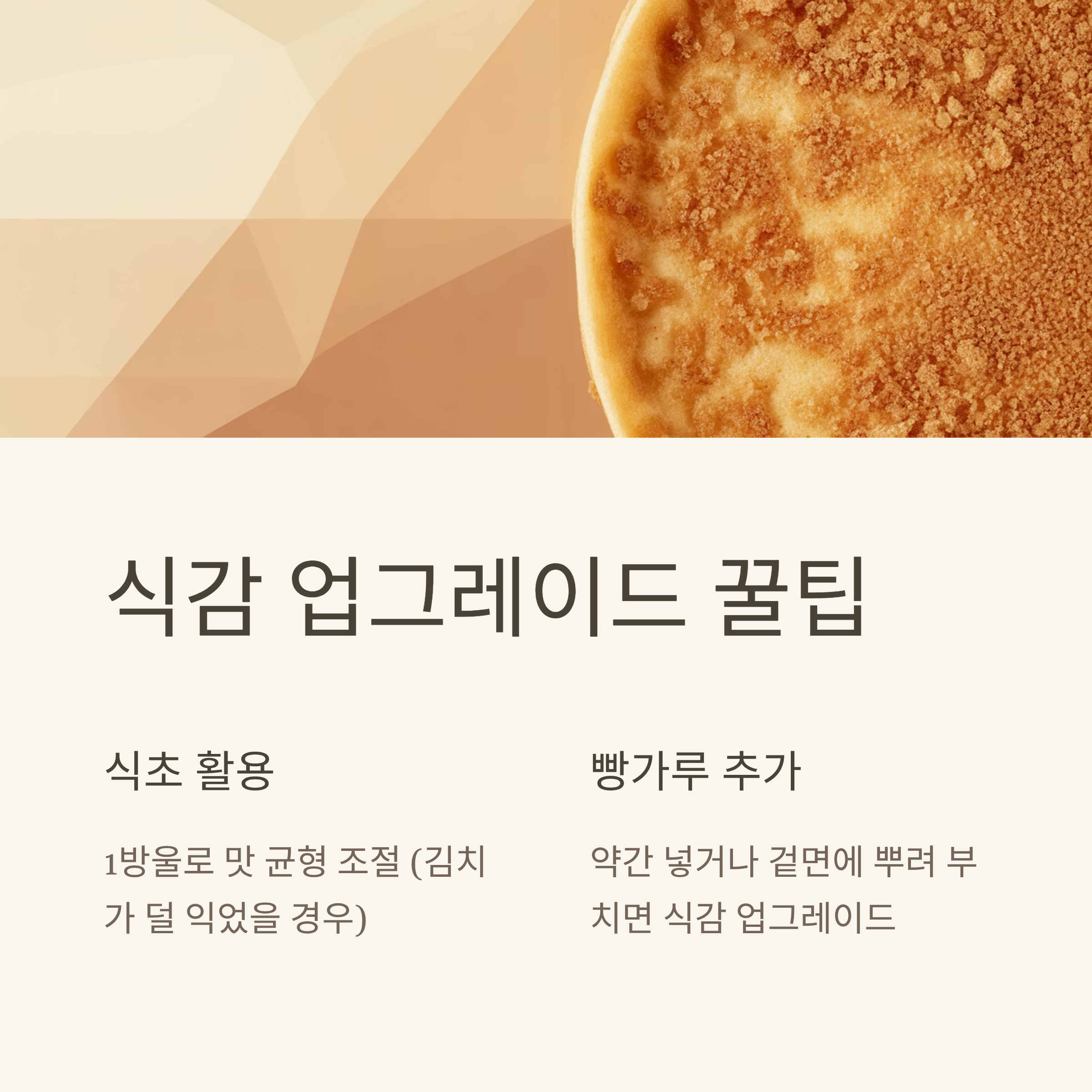 - 식초 1방울로 맛 균형 조절 (김치가 덜 익었을 경우)