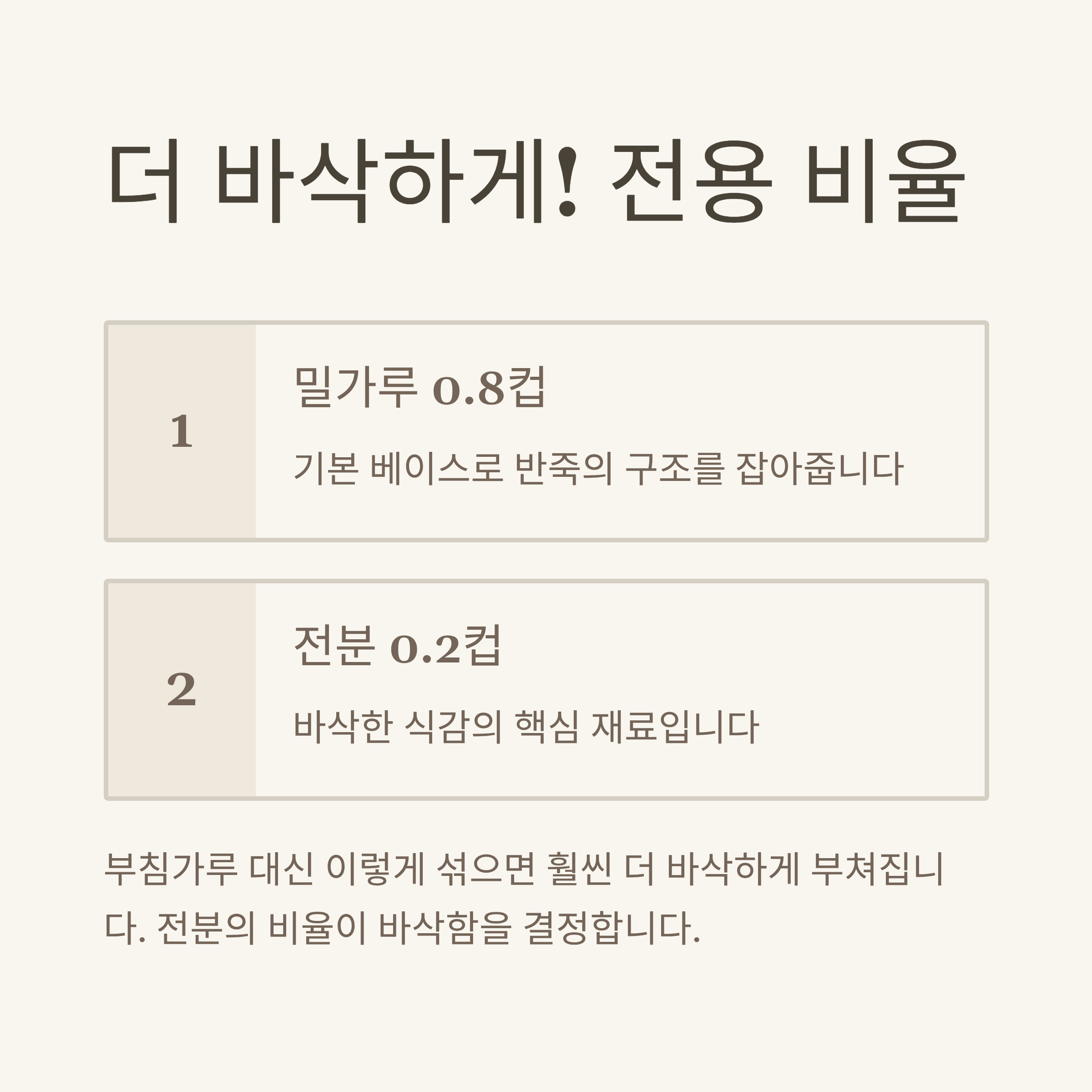 - 전분은 감자전분, 옥수수전분 모두 가능하며, 바삭한 식감을 강화합니다.