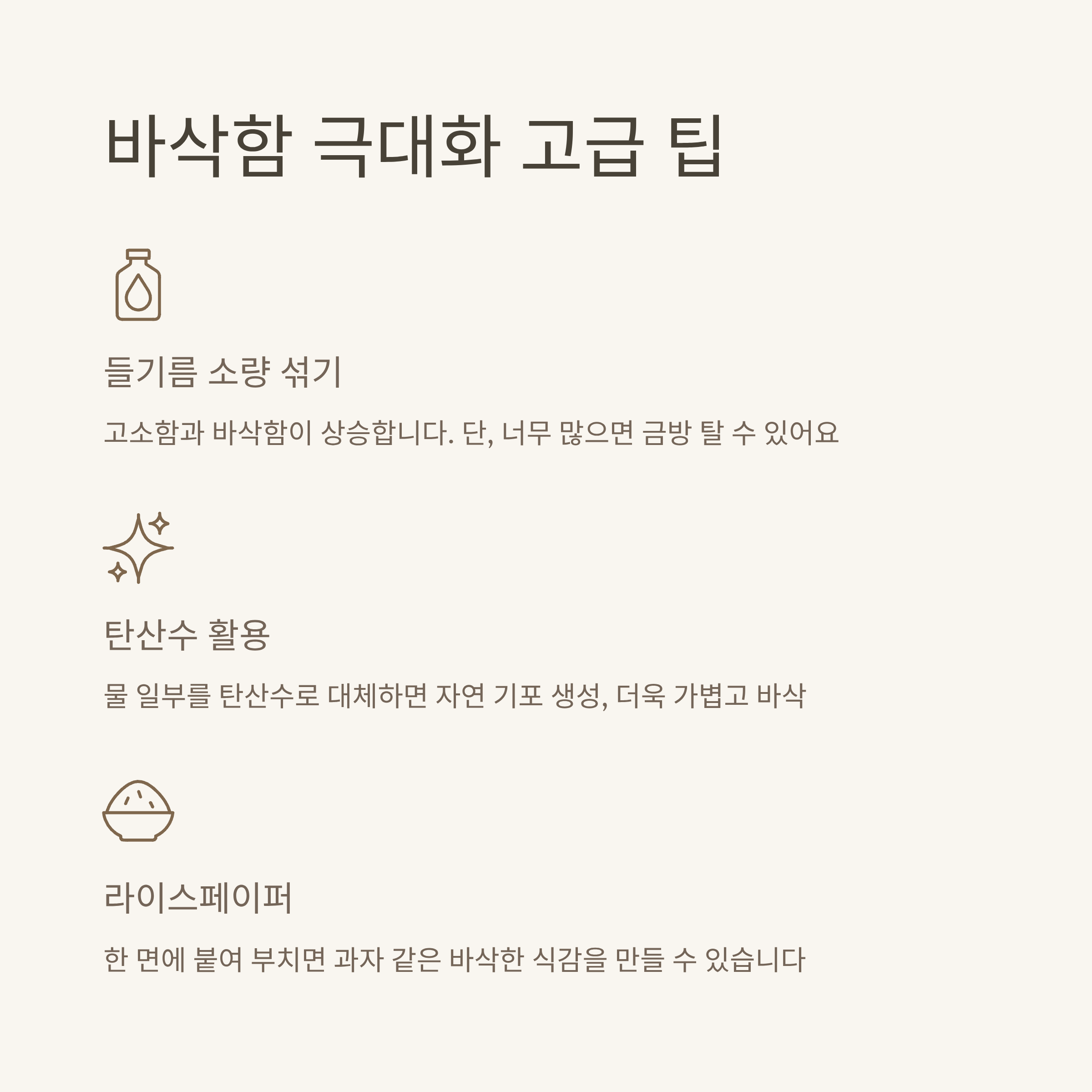 - 물 일부를 탄산수로 대체: 반죽에 자연 기포 생성, 더욱 가볍고 바삭