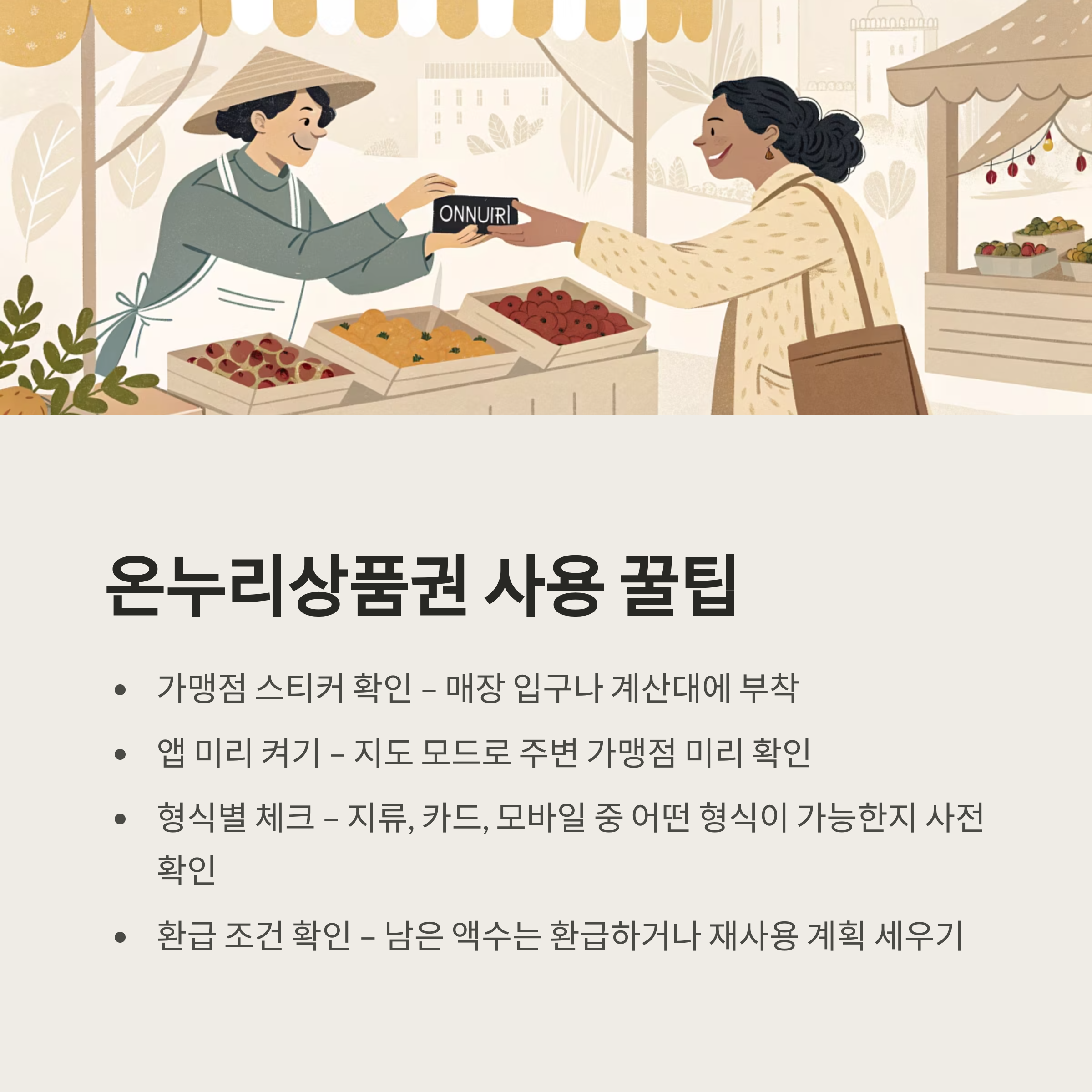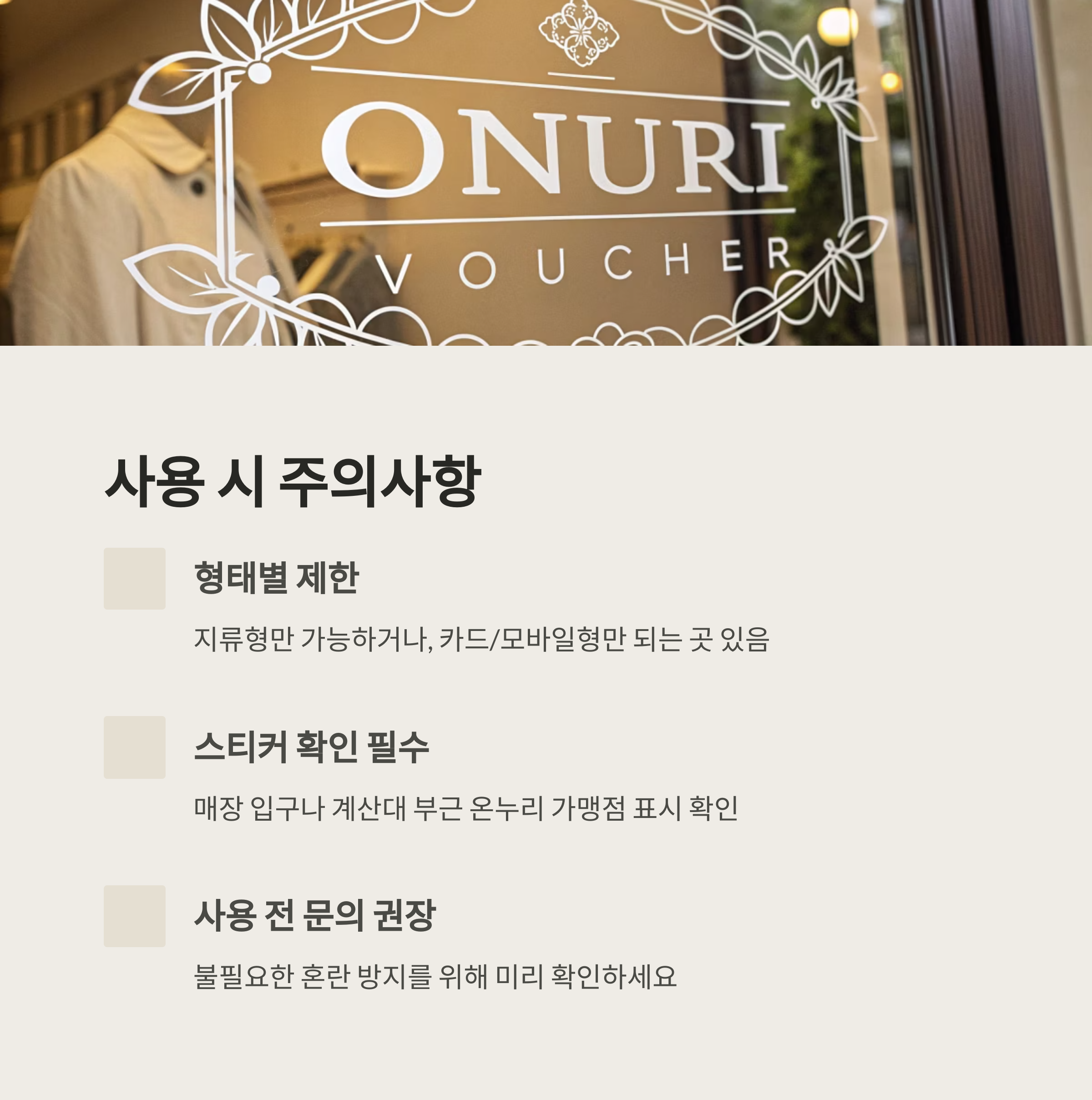 - 스티커 확인 필수: 매장 입구나 계산대 부근 온누리 가맹점 표시 확인