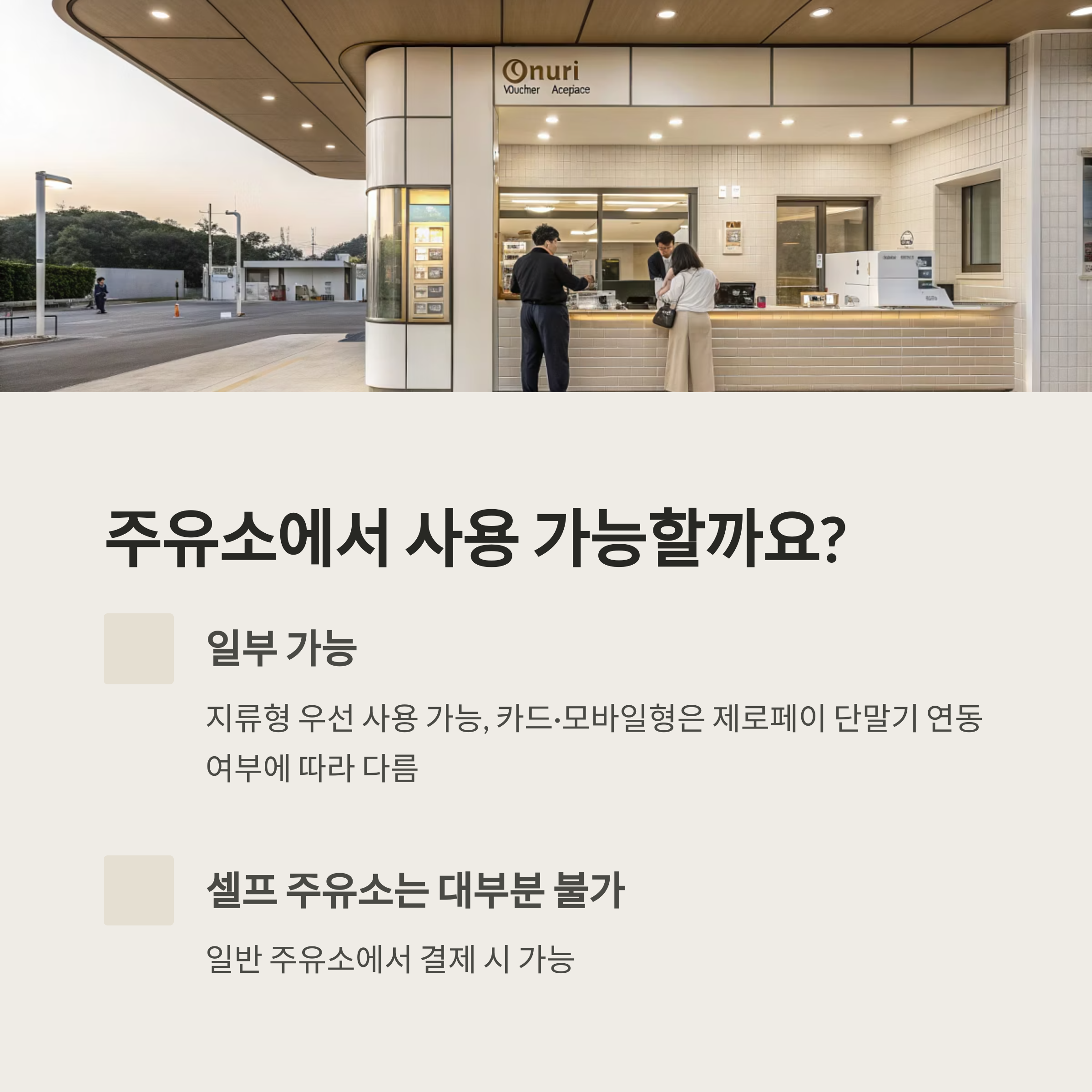 - 셀프 주유소는 대부분 불가, 일반 주유소에서 결제 시 가능