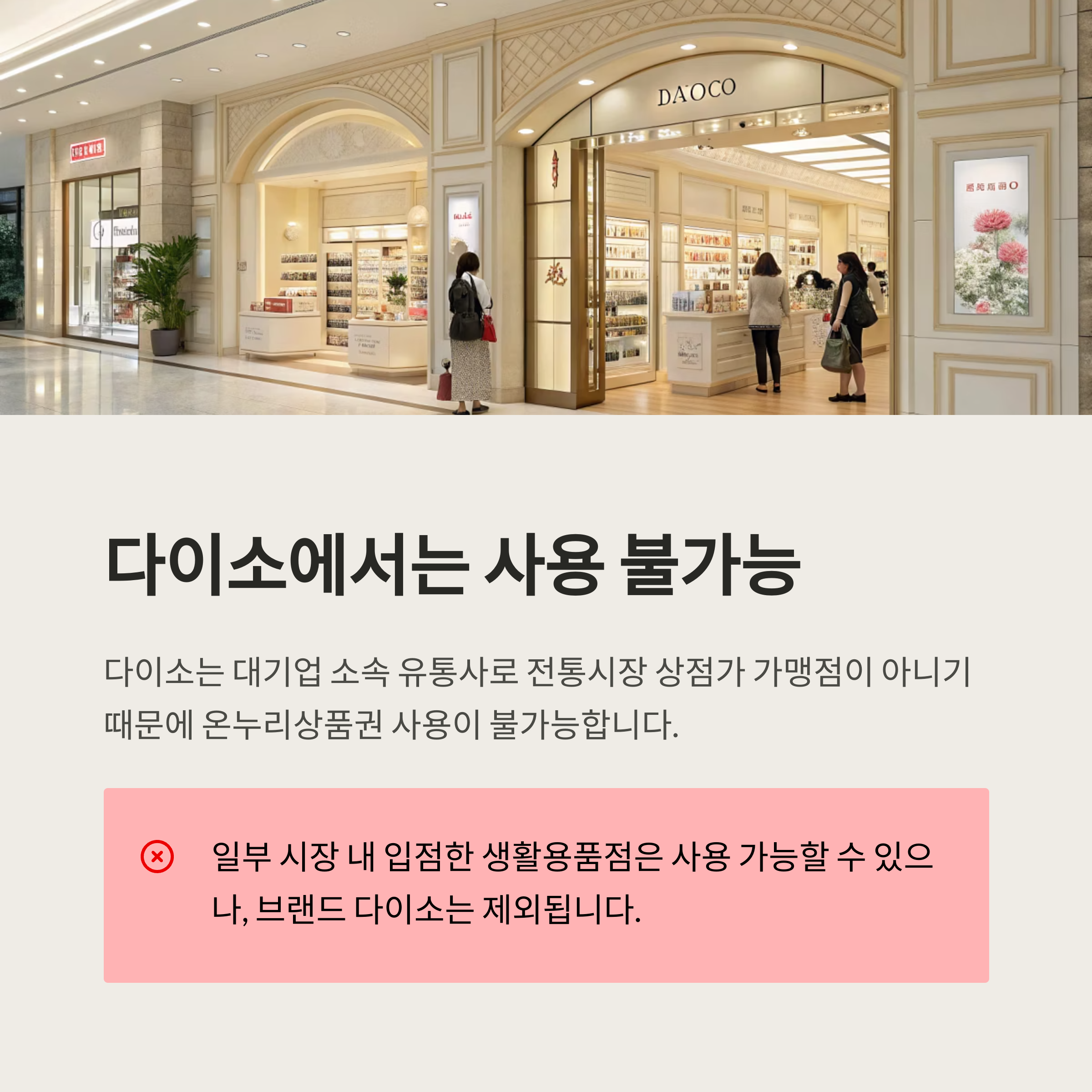 ※ 일부 ‘시장 내 입점한 생활용품점’은 사용 가능할 수 있으나, 브랜드 다이소는 제외