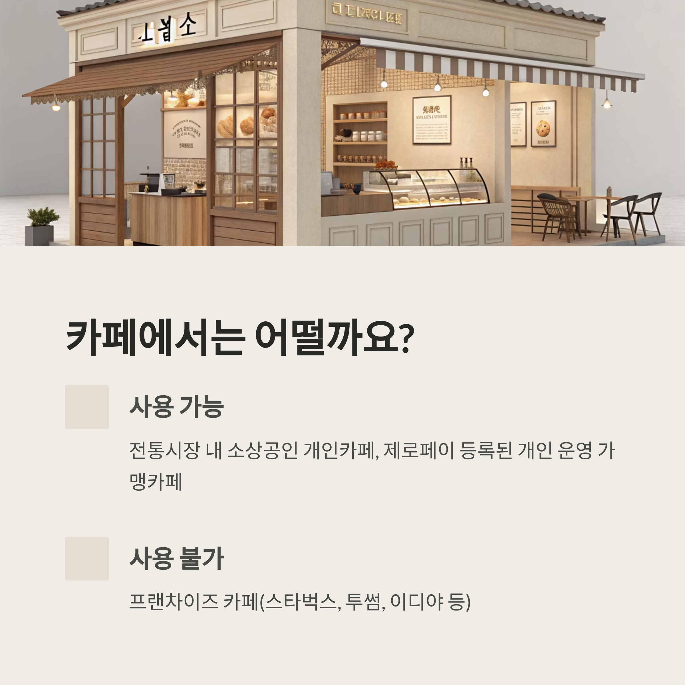 - 프랜차이즈 카페(스타벅스, 투썸, 이디야 등)는 대부분 사용 불가입니다.