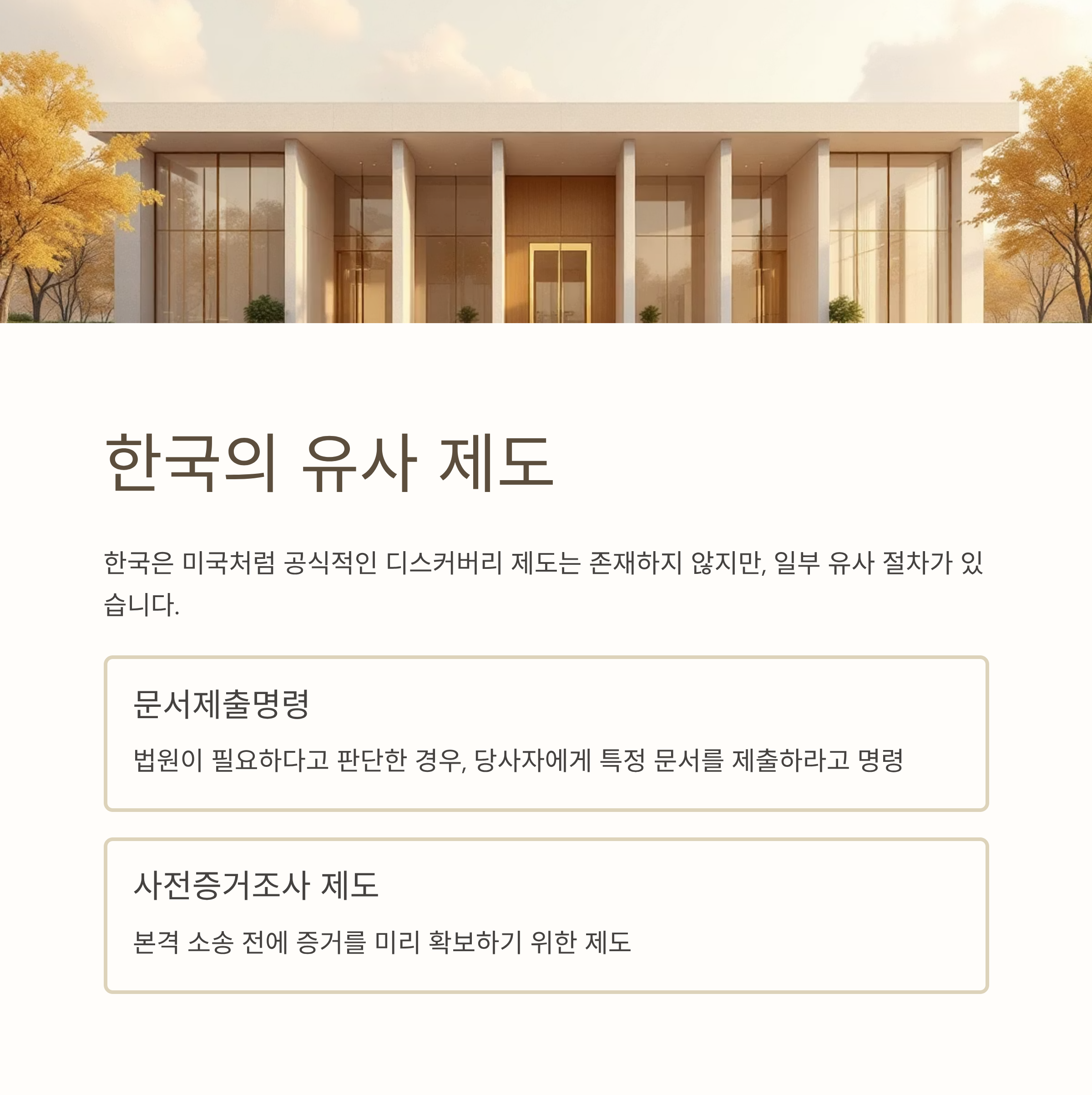 - 한국은 미국처럼 공식적인 ‘디스커버리 제도’는 존재하지 않지만, 일부 유사 절차가 있습니다.