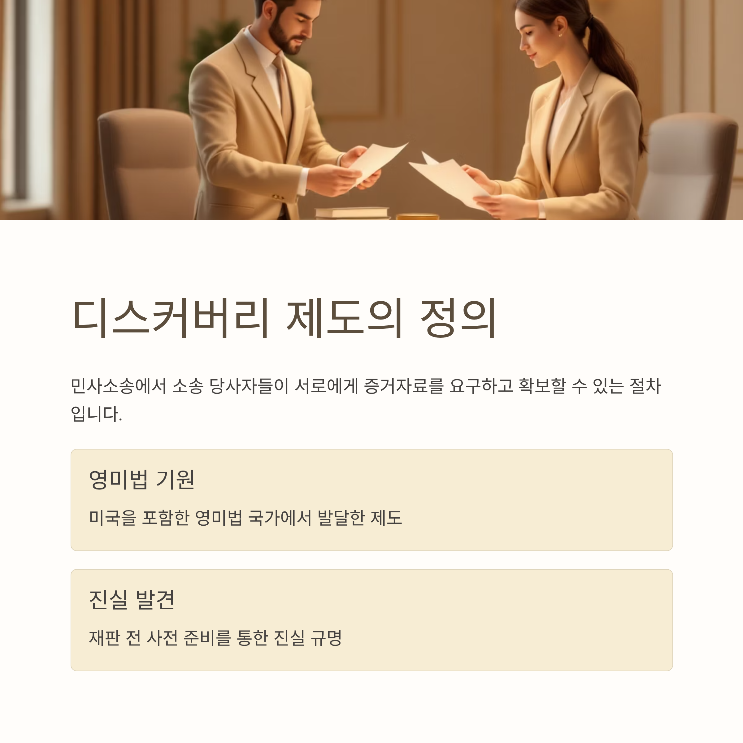 "디스커버리 제도(Discovery System)"는 민사소송에서 소송 당사자들이 서로에게 증거자료를 요구하고 확보할 수 있는 절차를 의미합니다. 주로 미국을 포함한 영미법 국가에서 발달한 제도로, ‘진실 발견’을 위한 사전 준비 절차입니다.
