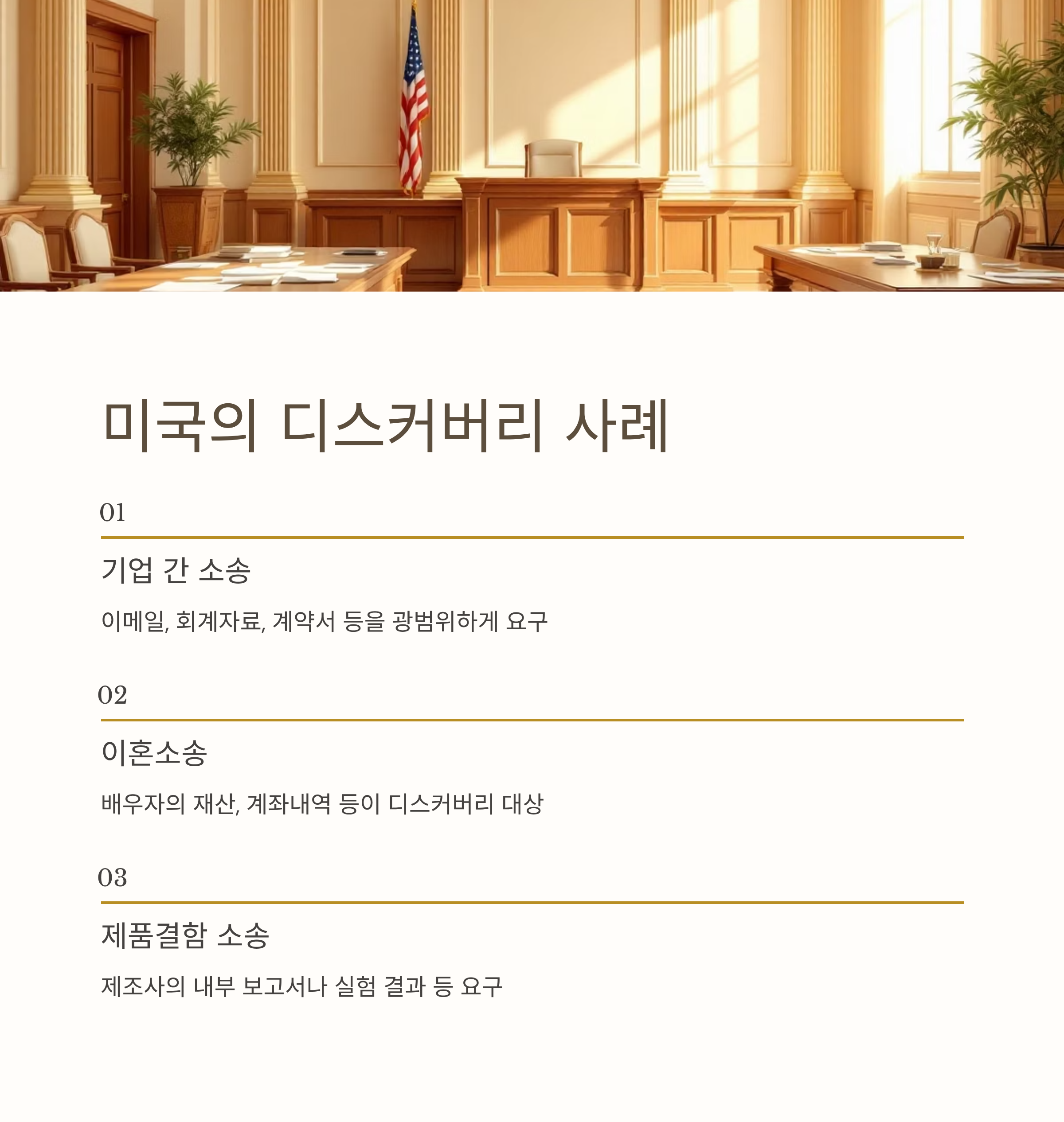 - 합의 가능성 증대: 디스커버리 결과를 통해 당사자들이 사실관계를 명확히 파악하여, 재판 전에 합의할 가능성이 커집니다.