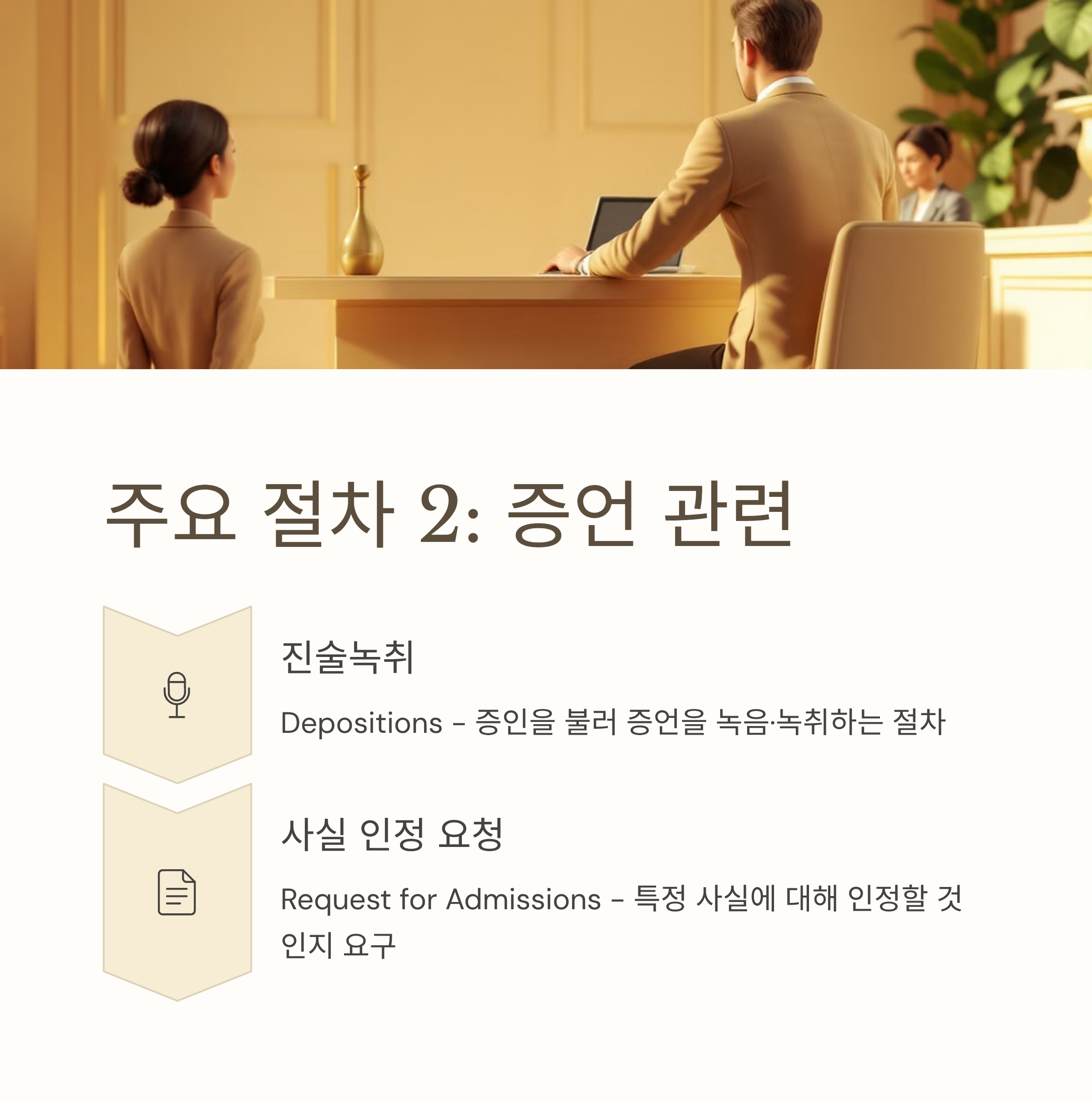 | 진술녹취(Depositions) | 증인을 불러 증언을 녹음·녹취 |