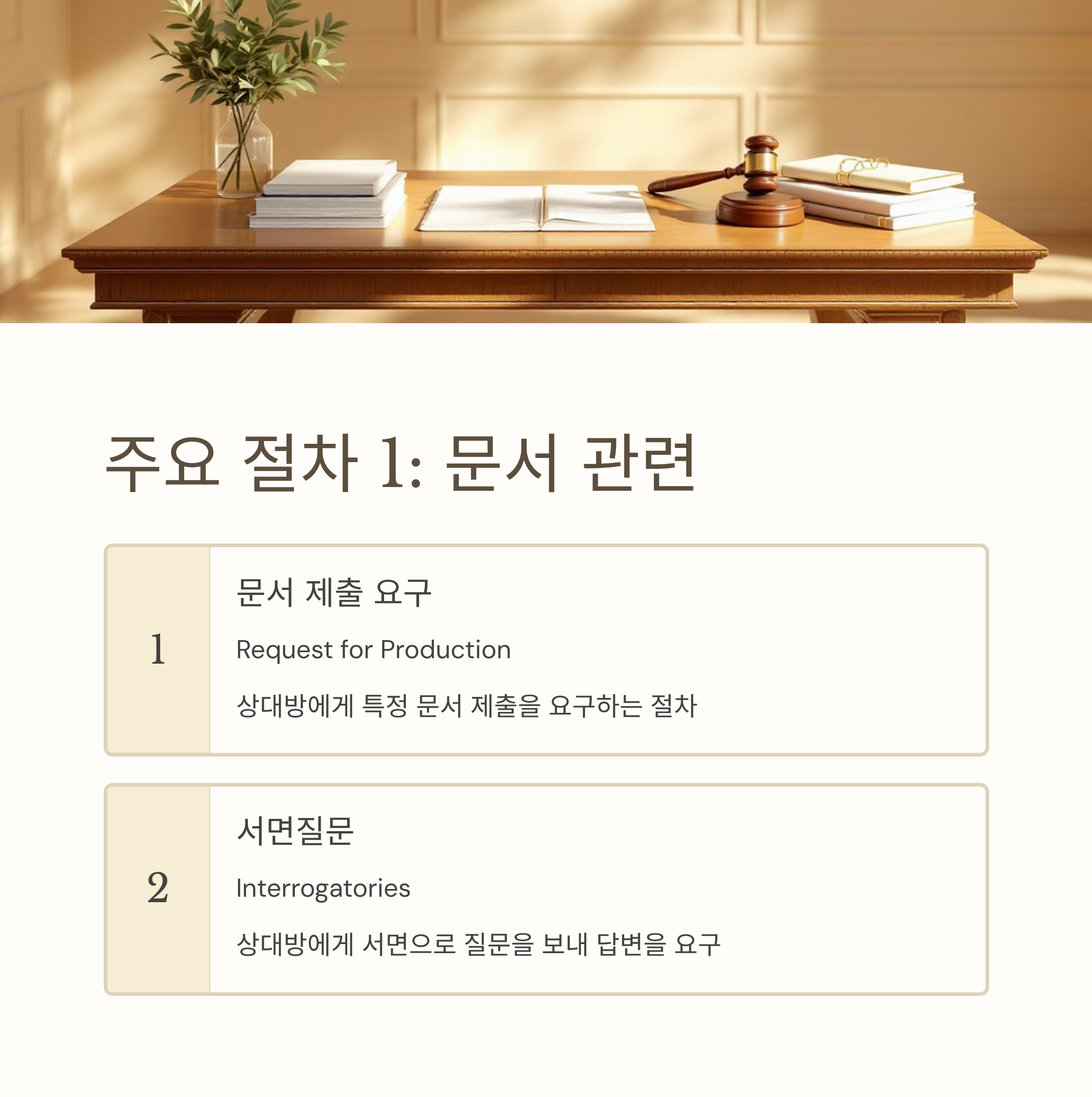 | 문서 제출 요구(Request for Production) | 상대방에게 특정 문서 제출을 요구 |