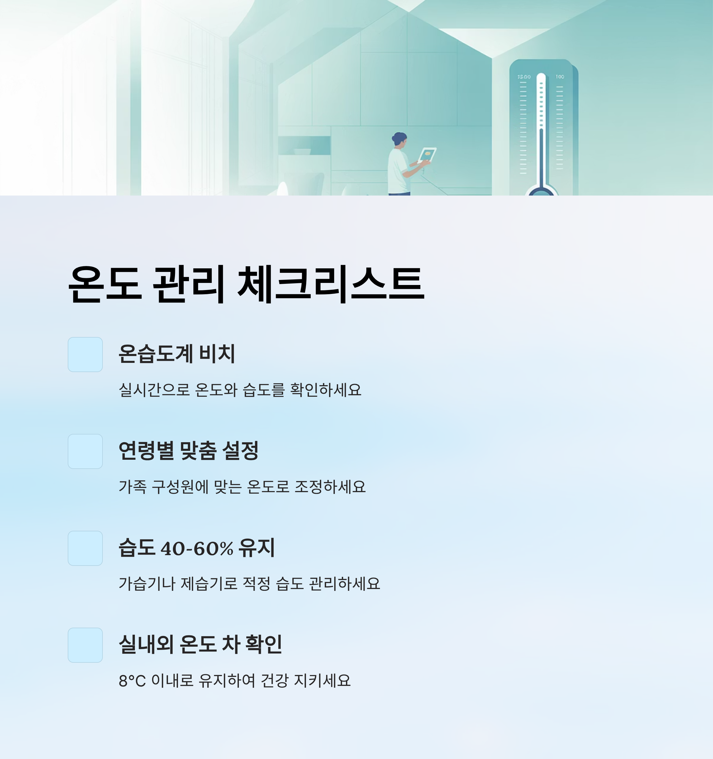 실내 온도는 무조건 높게가 아니라, 연령·상황별로 적정하게, 습도는 40~60%를 꼭 유지하세요.