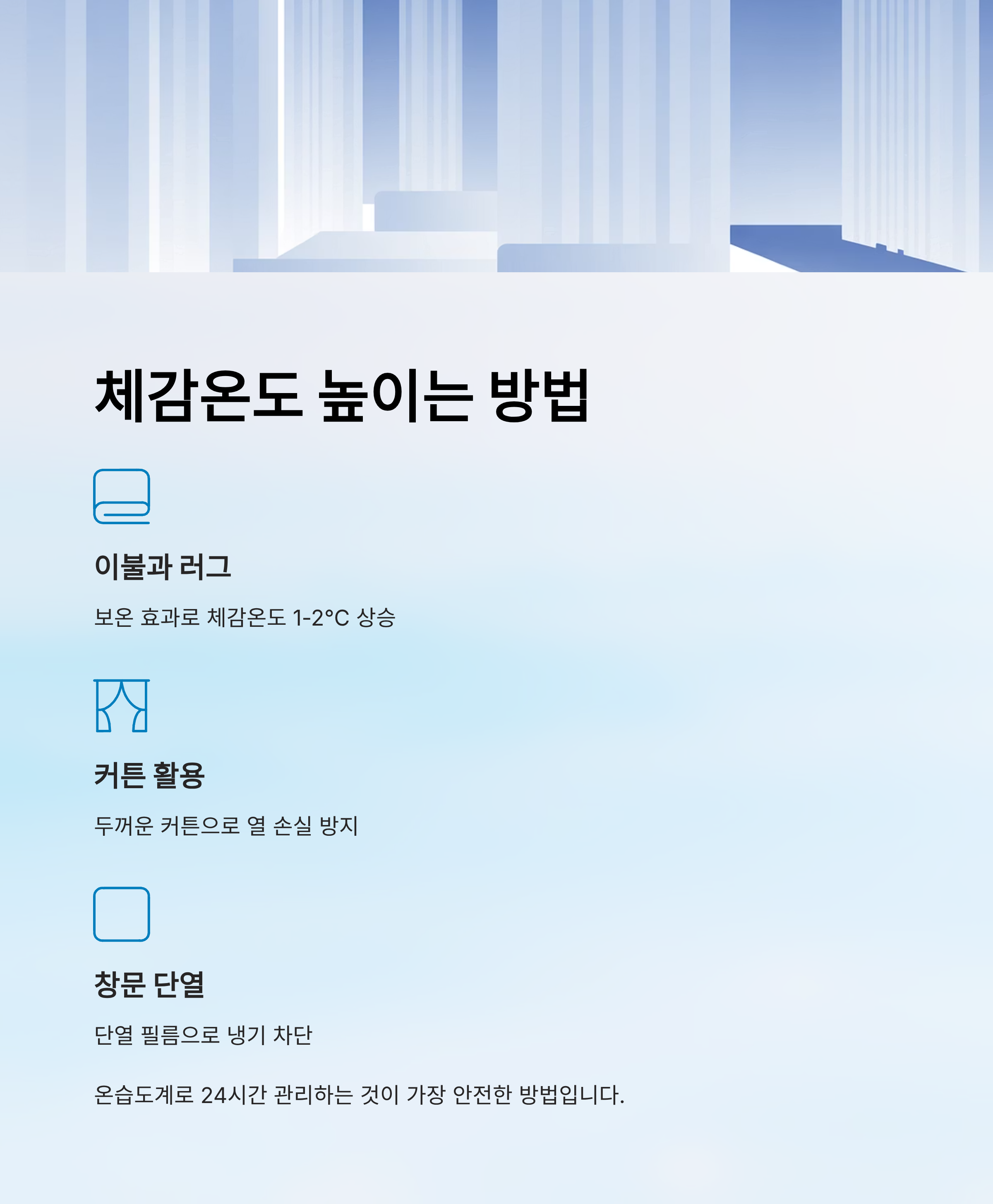 - 이불, 러그, 커튼, 창문 단열 등으로 체감온도 1~2℃ 보완 가능