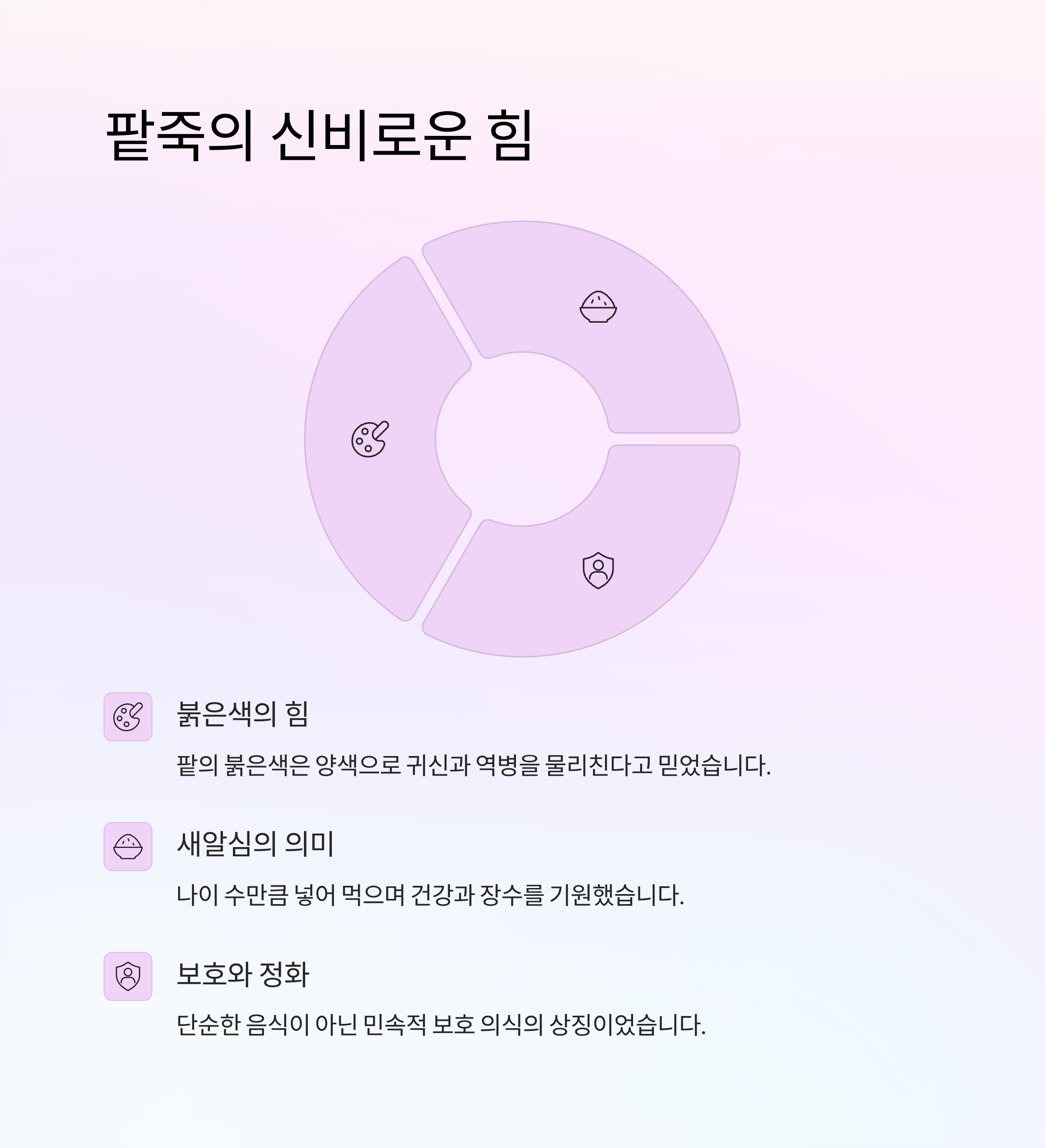 - 팥의 붉은색은 음기를 쫓는 양색(陽色)으로, 귀신·역병·액운을 물리친다고 믿었습니다.