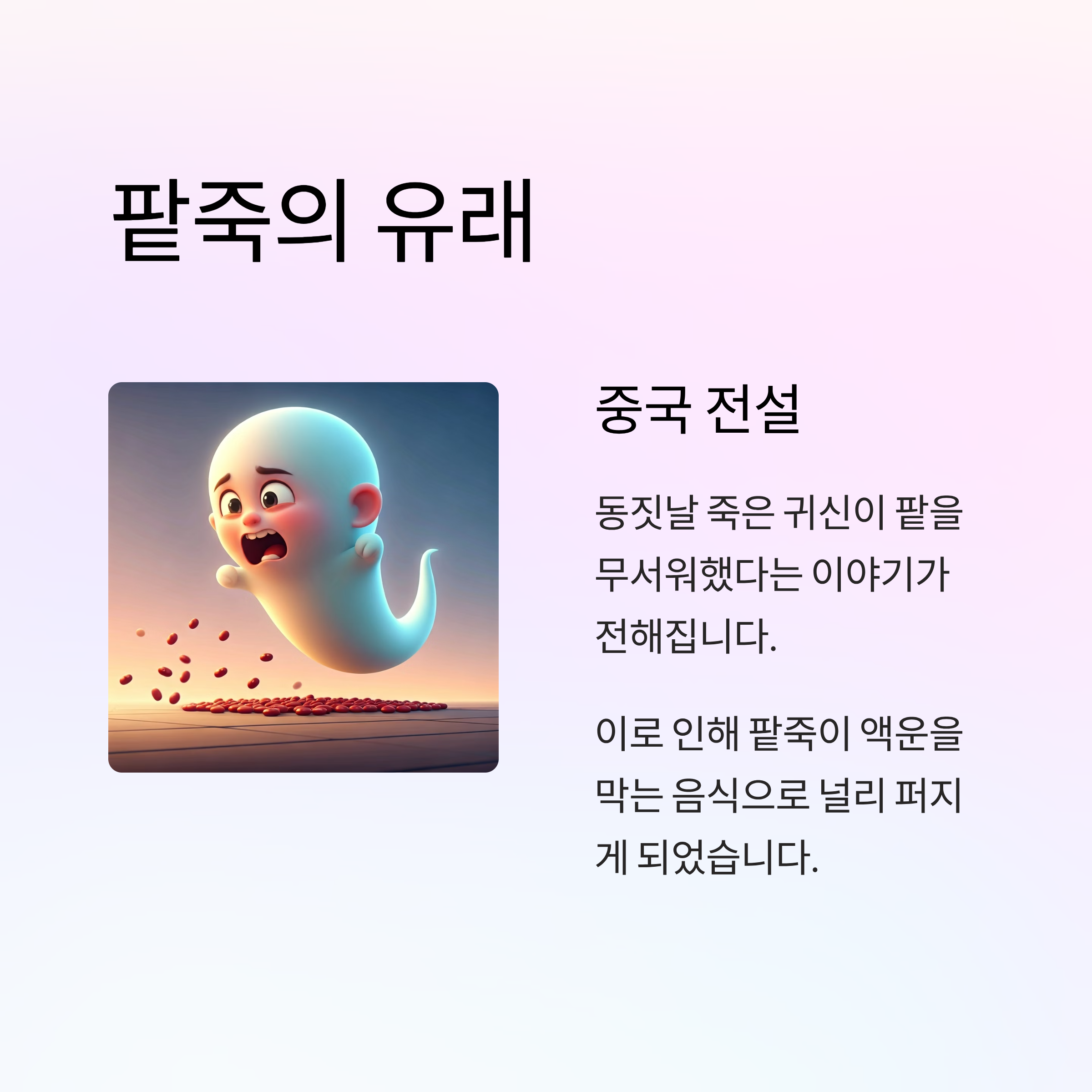 - 중국 전설에서는 동짓날 죽은 귀신이 팥을 무서워했다는 이야기가 전하며, 그로 인해 팥죽이 널리 퍼졌습니다.