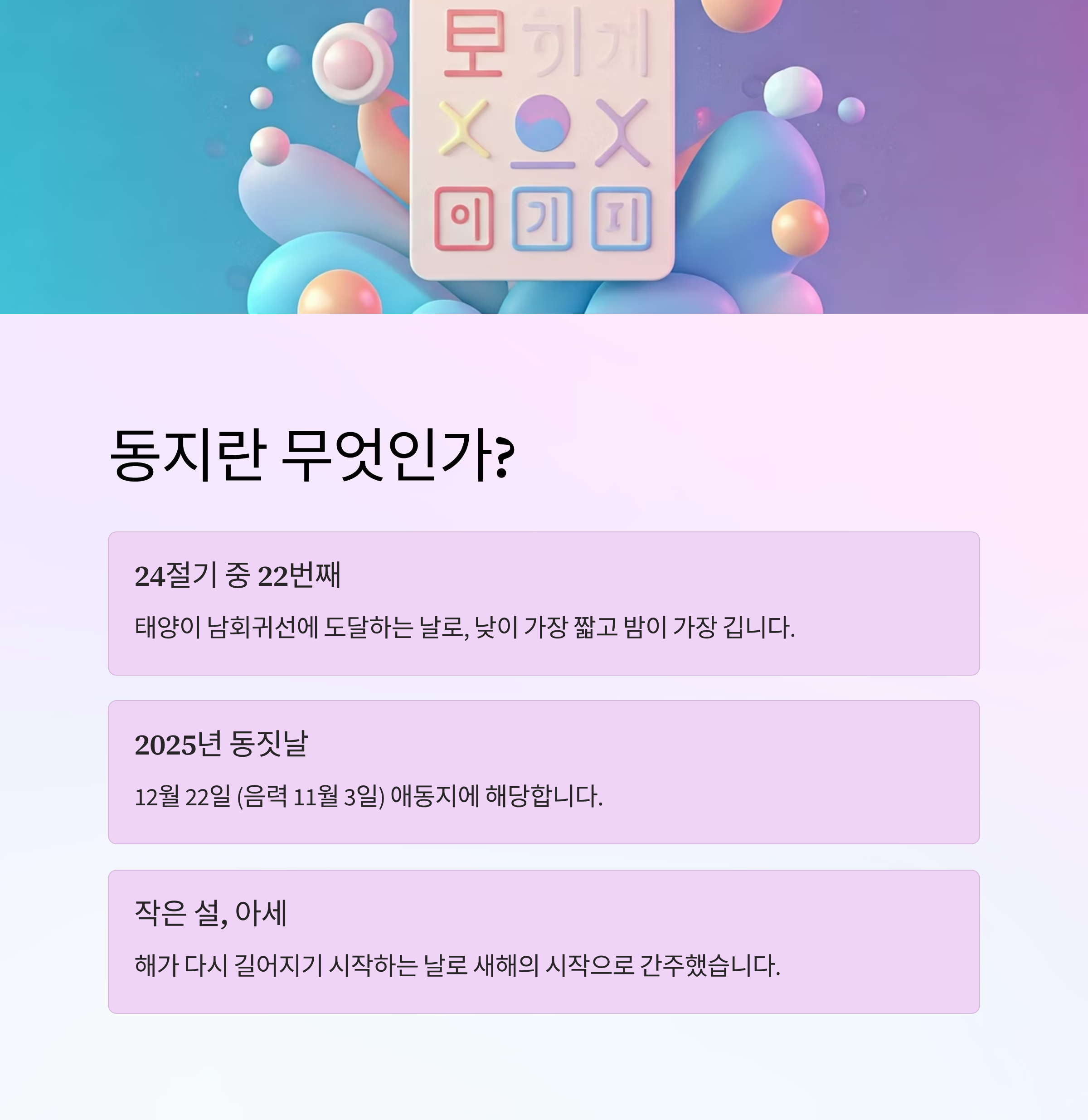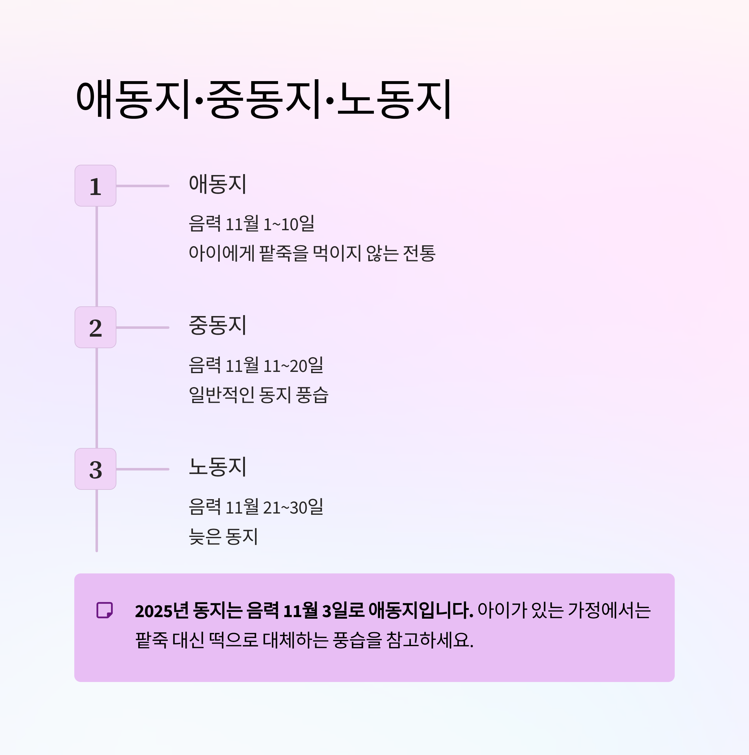 2025년 동지는 음력 11월 3일로 애동지에 해당합니다. 아이가 있는 가정에서는 팥죽 대신 떡으로 대체하는 풍습을 참고하면 좋습니다.