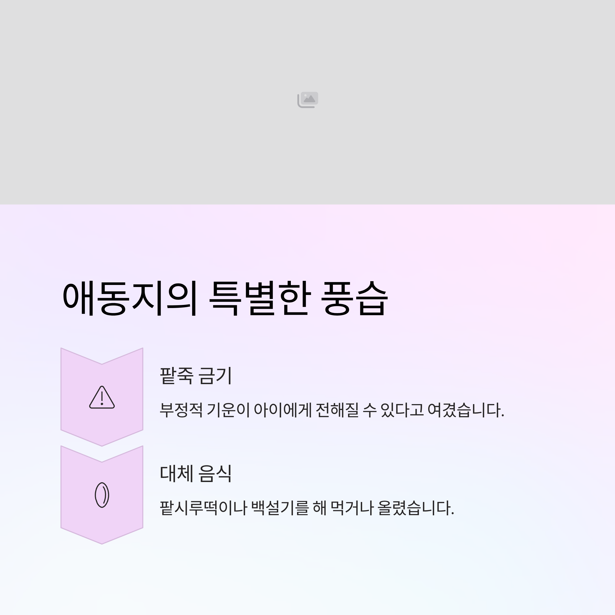 - 애동지에는 아이에게 팥죽을 먹이지 않거나 쑤지 않는 전통이 있습니다. 이유는 팥죽의 부정적인 기운이 아이에게 전해질 수 있다고 여겼기 때문입니다.