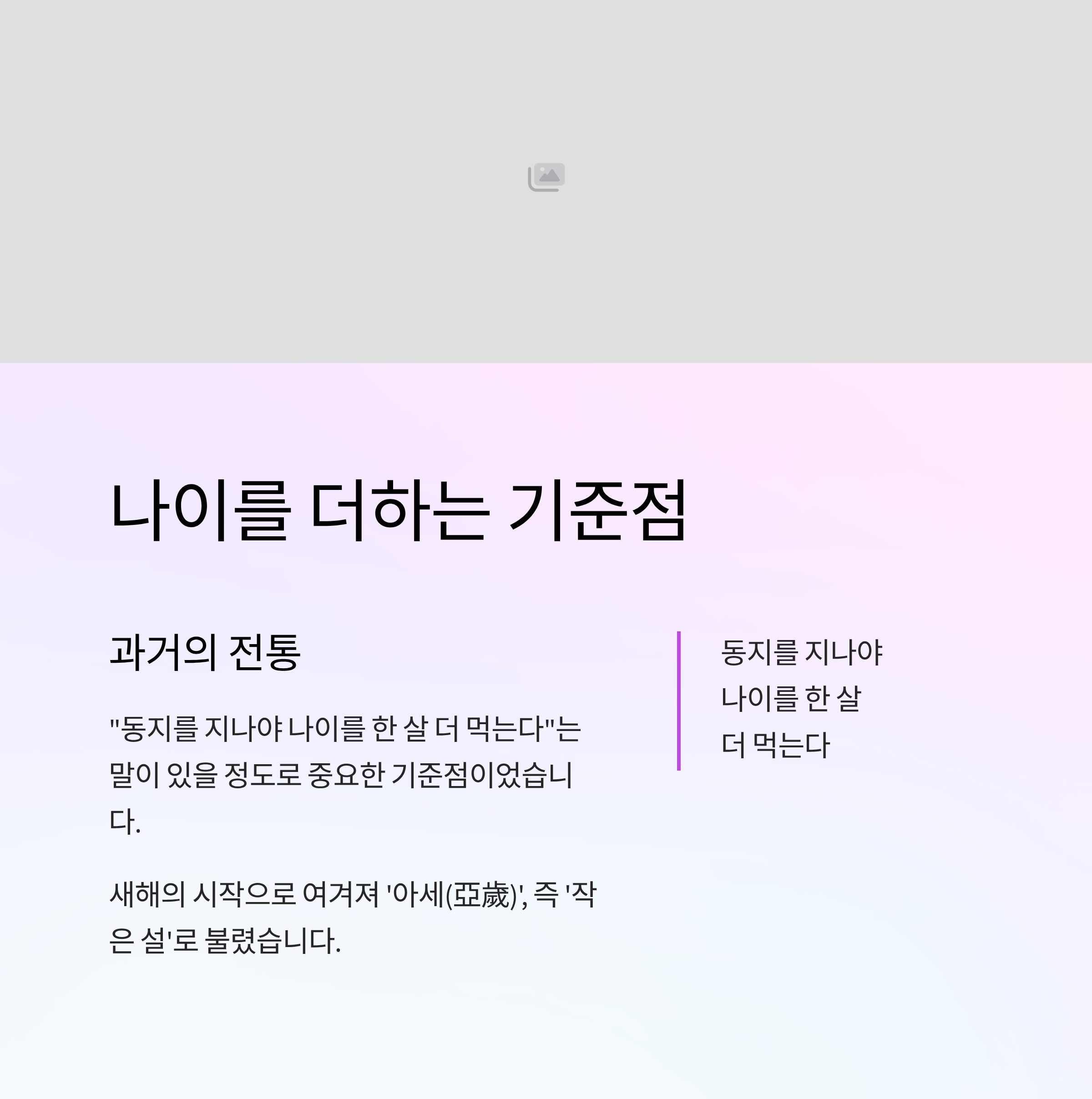 과거에는 “동지를 지나야 나이를 한 살 더 먹는다”는 말이 있을 정도로 나이 세는 기준점으로도 여겨졌습니다. 해가 짧아지는 것이 끝나고 다시 길어지기 시작하는 이 날을 새해의 시작으로 간주해 ‘아세(亞歲)’, 즉 ‘작은 설’로 불렀습니다.