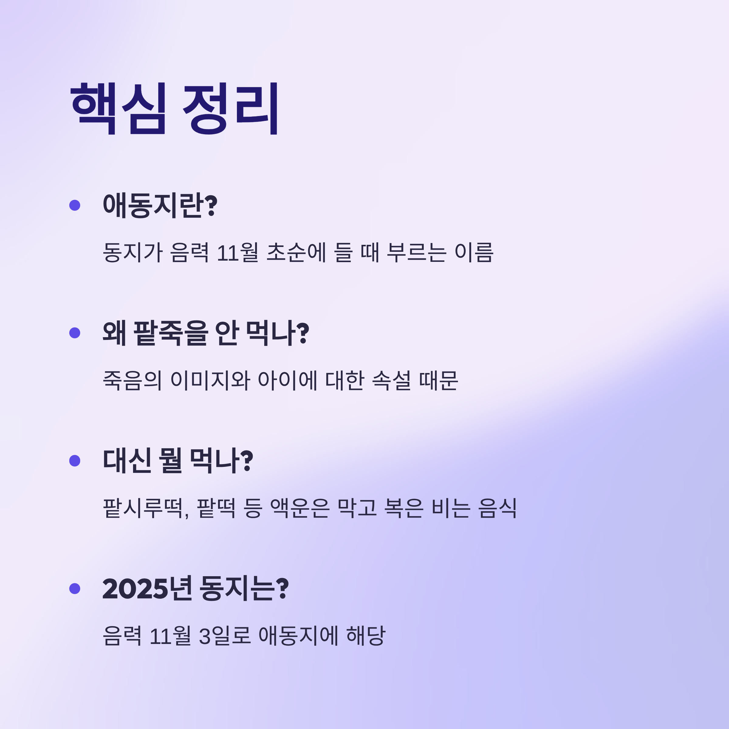 | 애동지 | 11월 1~10일 | 아이 동지, 조심스러운 날 | 팥시루떡, 팥떡 |