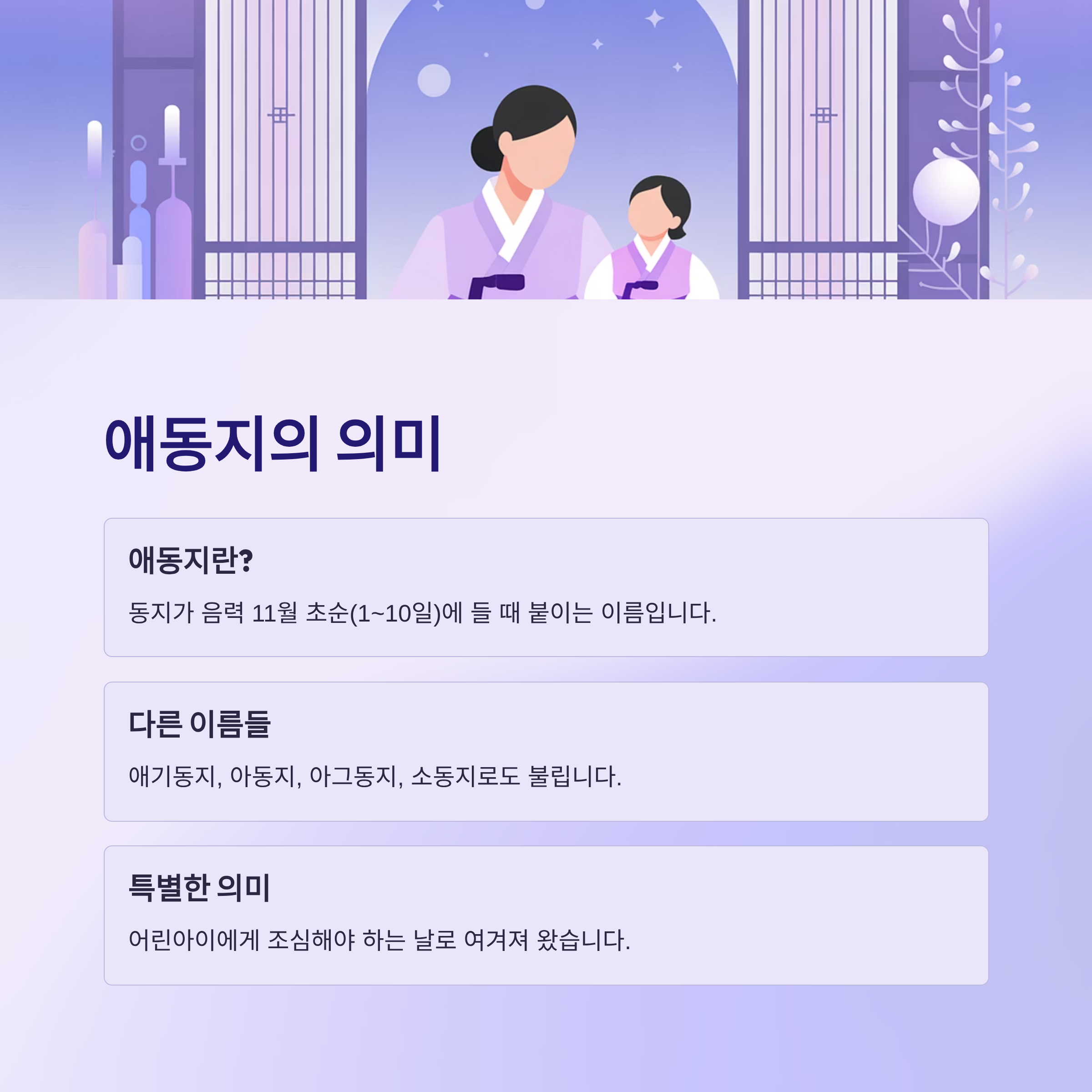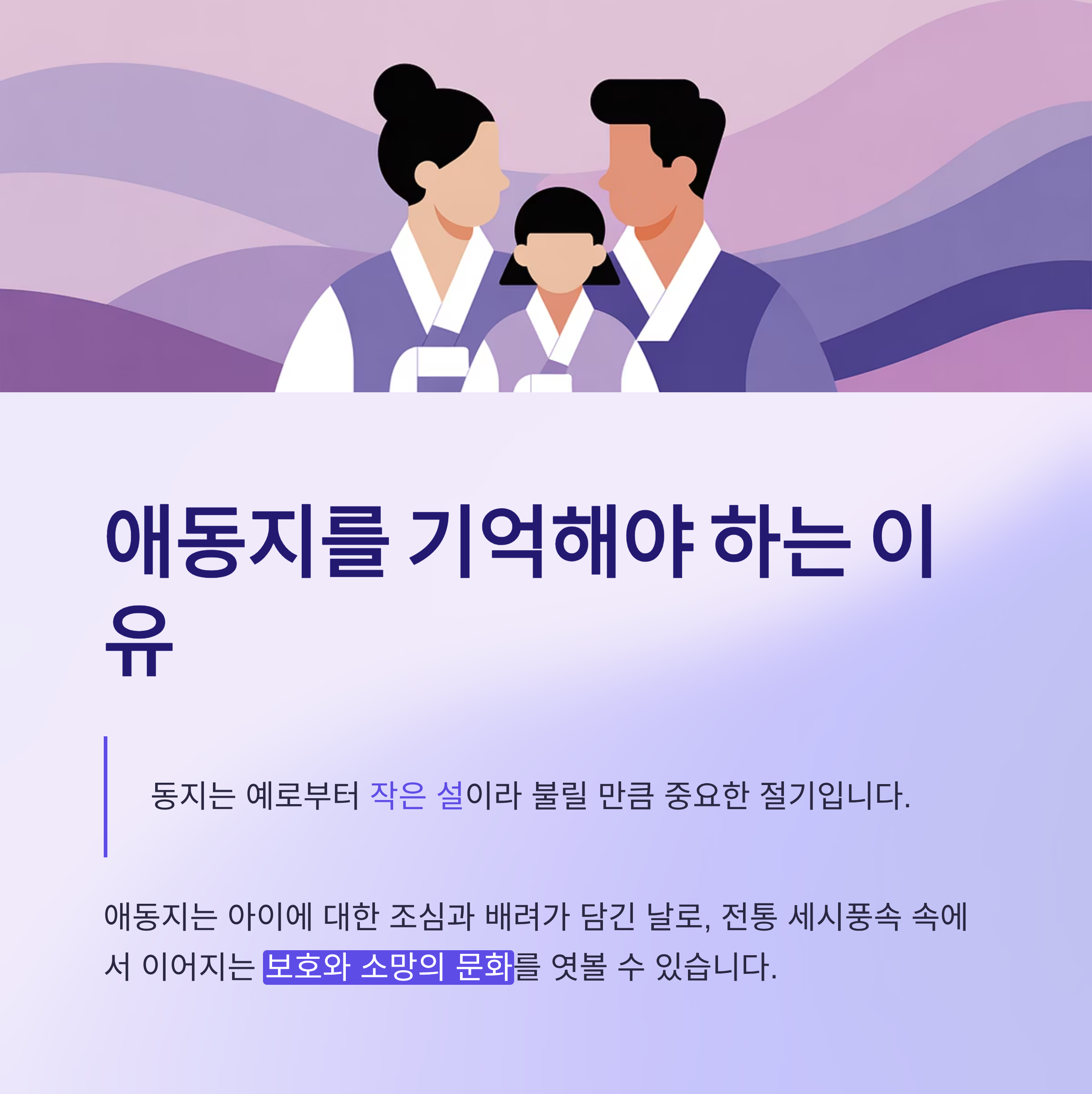 동지는 예로부터 작은 설이라 불릴 만큼 중요한 절기입니다. 그중에서도 애동지는 아이에 대한 조심과 배려가 담긴 날로, 지금도 전통 세시풍속 속에서 이어지는 보호와 소망의 문화를 엿볼 수 있습니다.